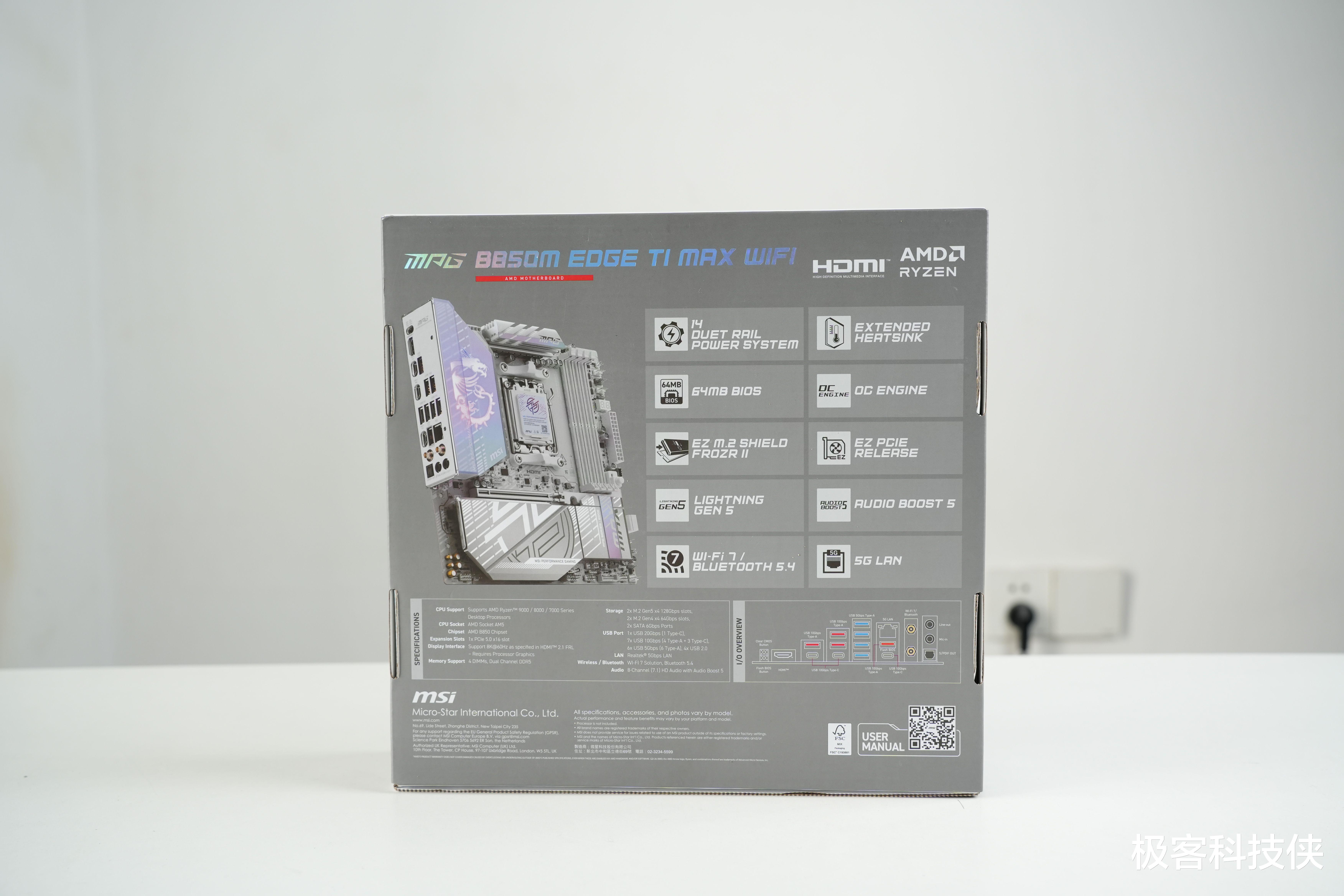 外观设计这款微星MPG B850M EDGE TI MAX WiFi刀锋钛主板的包装盒延续刀锋钛系列高端简约风格,融入全白化视觉元素。给人传递一种“颜值与实力并存的”调性。