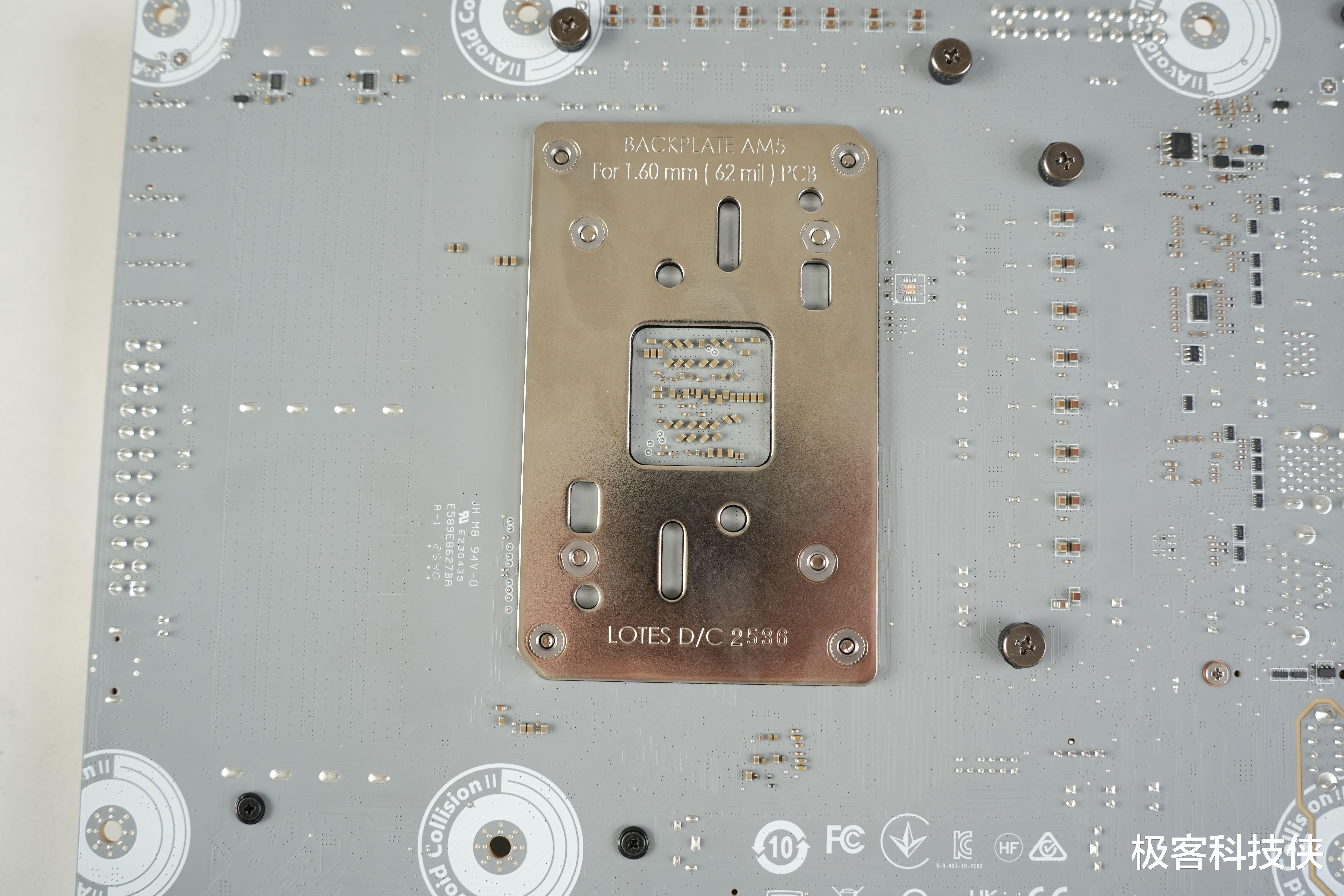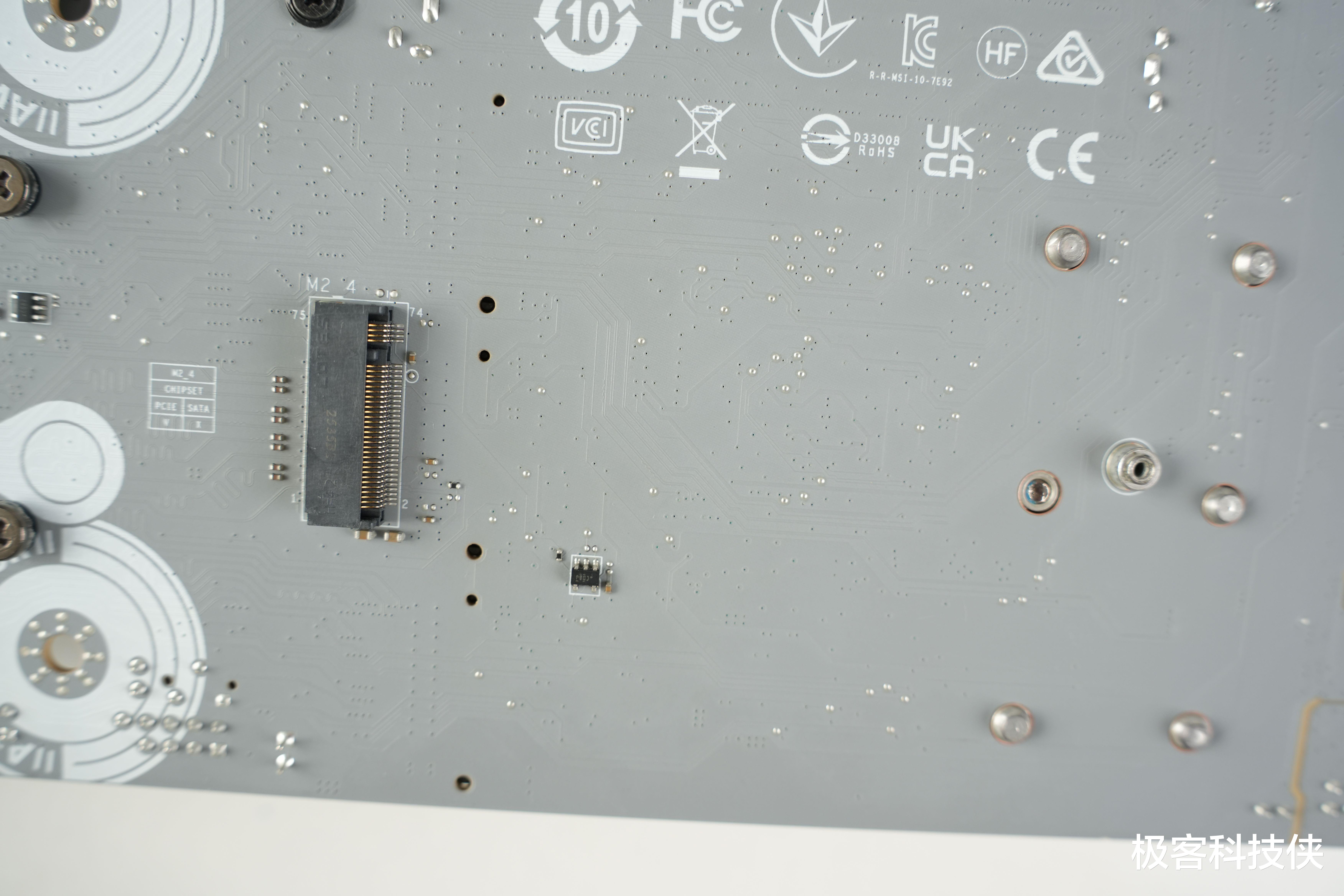 主板底部同样采用了一整块金属覆盖件,为了保证M.2固态部分和南桥拥有更好的散热性能。