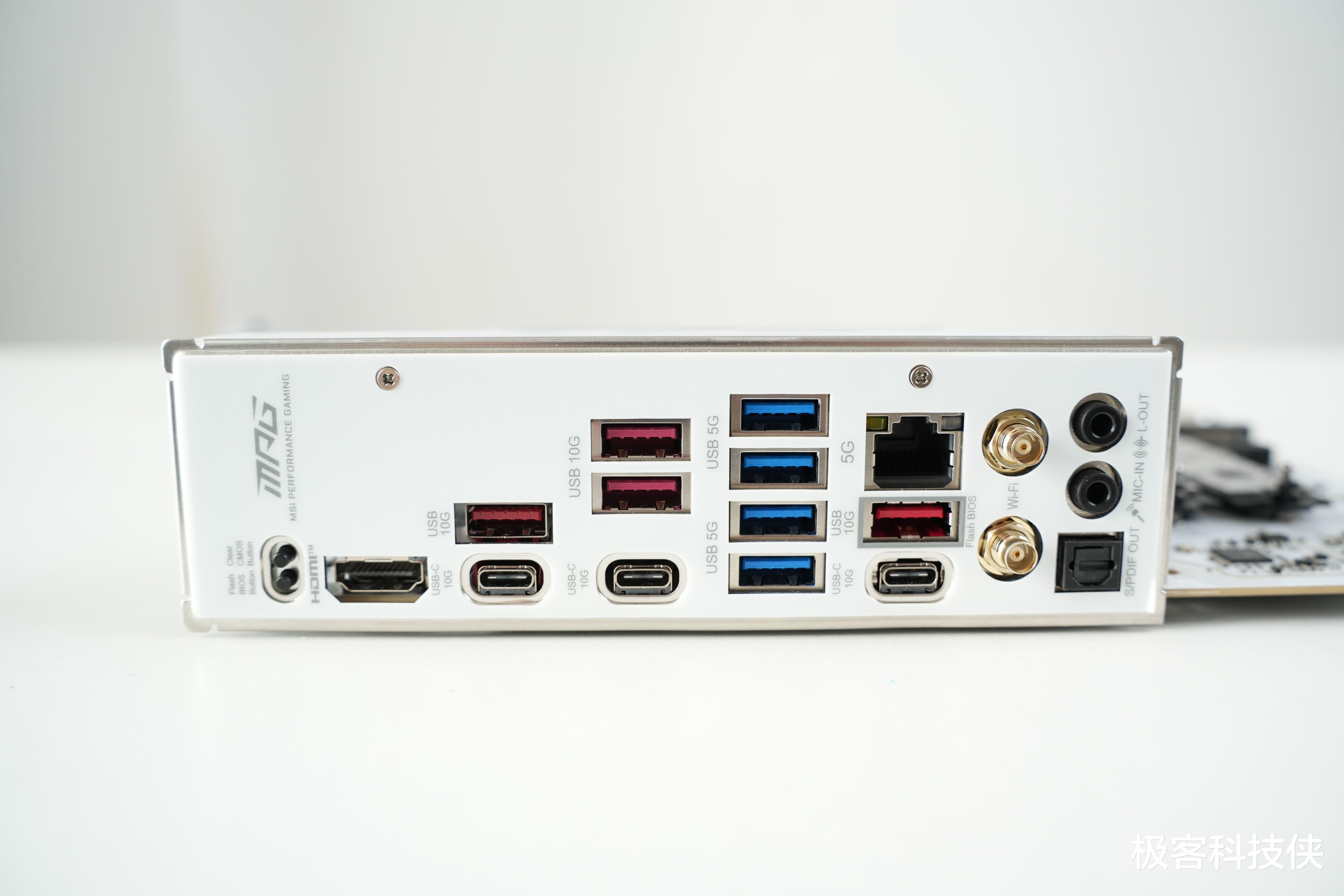 下方则是HDMI 2.1接口(8K@60Hz),然后是3个USB Type-C 10Gbps接口、4个USB-A 10Gbps接口(红色)以及4个USB-A 5Gbps接口(蓝色);最下方则是音频模块。网络则是搭载了5Gbps有线网口以及WiFi 7无线网卡。