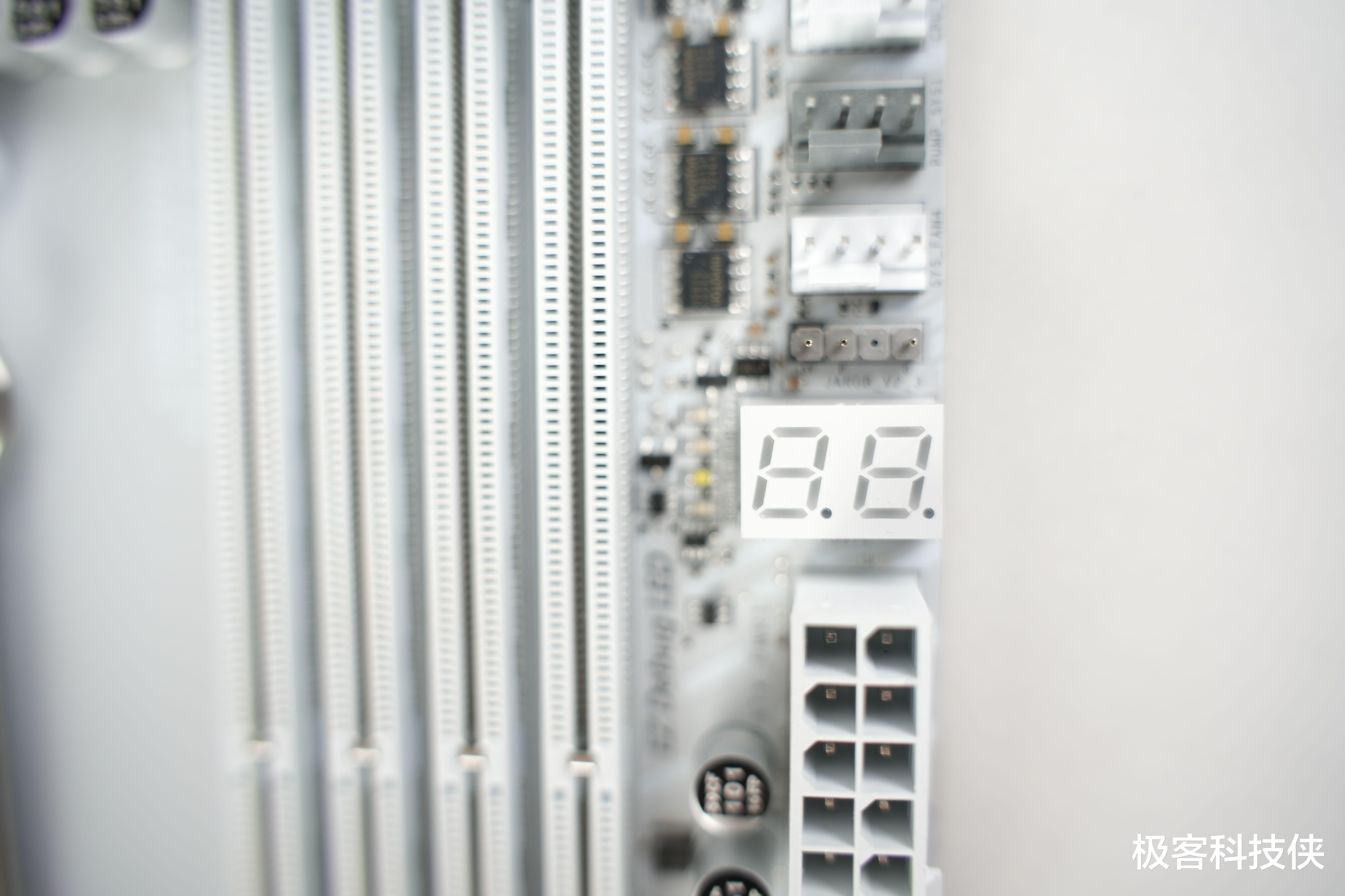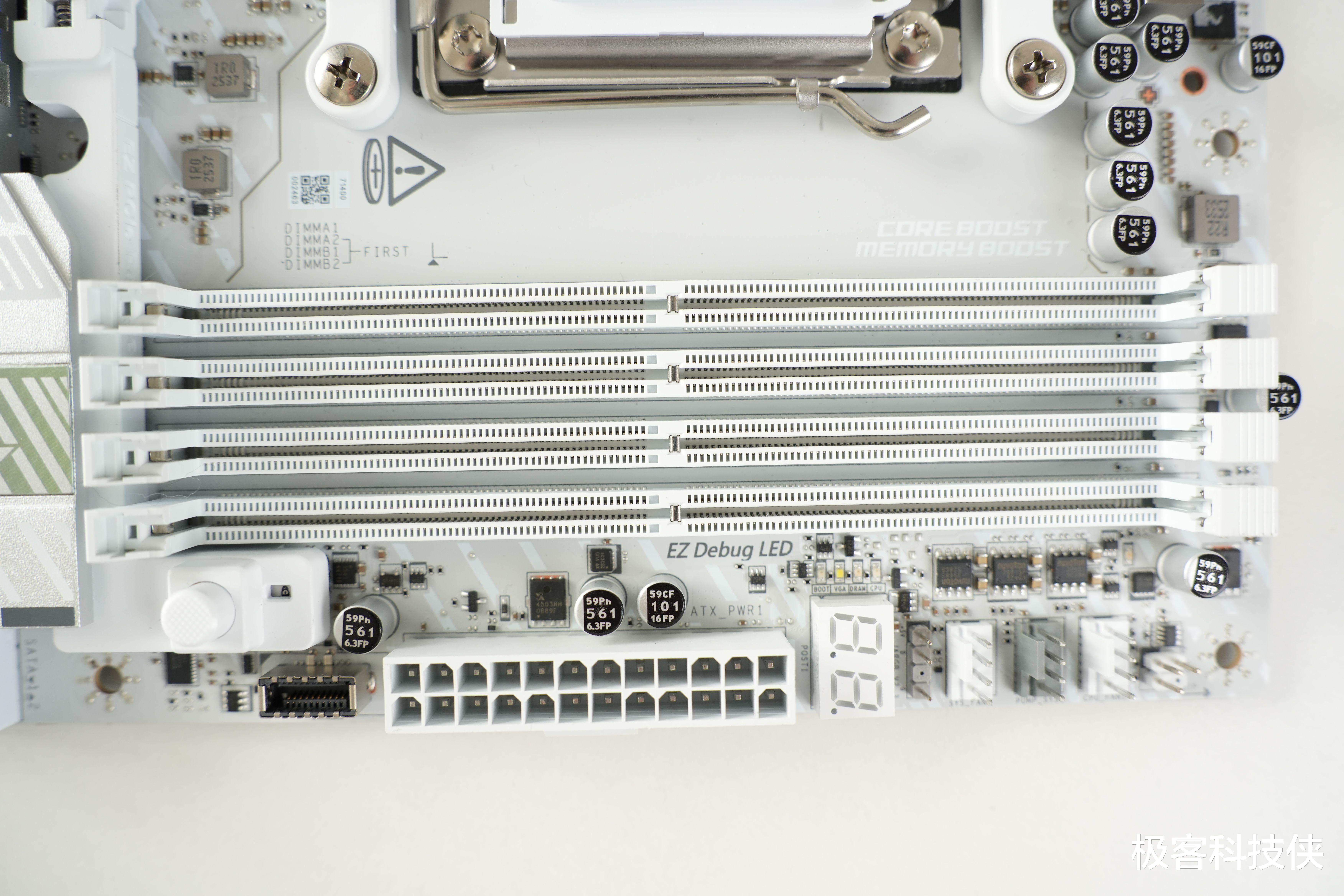 供电接口部分,微星MPG B850M EDGE TI MAX WiFi刀锋钛主板顶部设计了三个4pin供电接口和3pinRGB接口,主板右上角区域集成了EZ DEBUG LED 数字侦错灯和直观的双数位诊断码显示屏。尤其值得一提的是水泵还特意做了标记,对于装机小白来说非常友好。