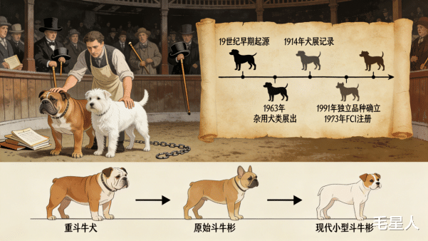 早期小型斗牛梗体型差异极大,小型个体体重仅1.81~3.18公斤,中型个体则可达2.27~7.26公斤,毛色也十分多样,包括黑色斑纹、蓝色及纯白色等,其中白色个体曾被英格兰养犬俱乐部称为“cover wood Ferriers”。1914年前后,小型斗牛梗曾参与国外犬展,但因外形不受青睐而反应冷淡。直到1963年,它被归于杂用犬类合法公开展出,1991年正式被认可为独立品种,1993年被联邦养狗人俱乐部登记注册,完成了从竞技犬到伴侣犬的转型。如今,它以独特的“蛋形头”外貌和温顺性格,成为全球受欢迎的小型伴侣犬之一,在2024年AKC犬种排名中位列第63位。
