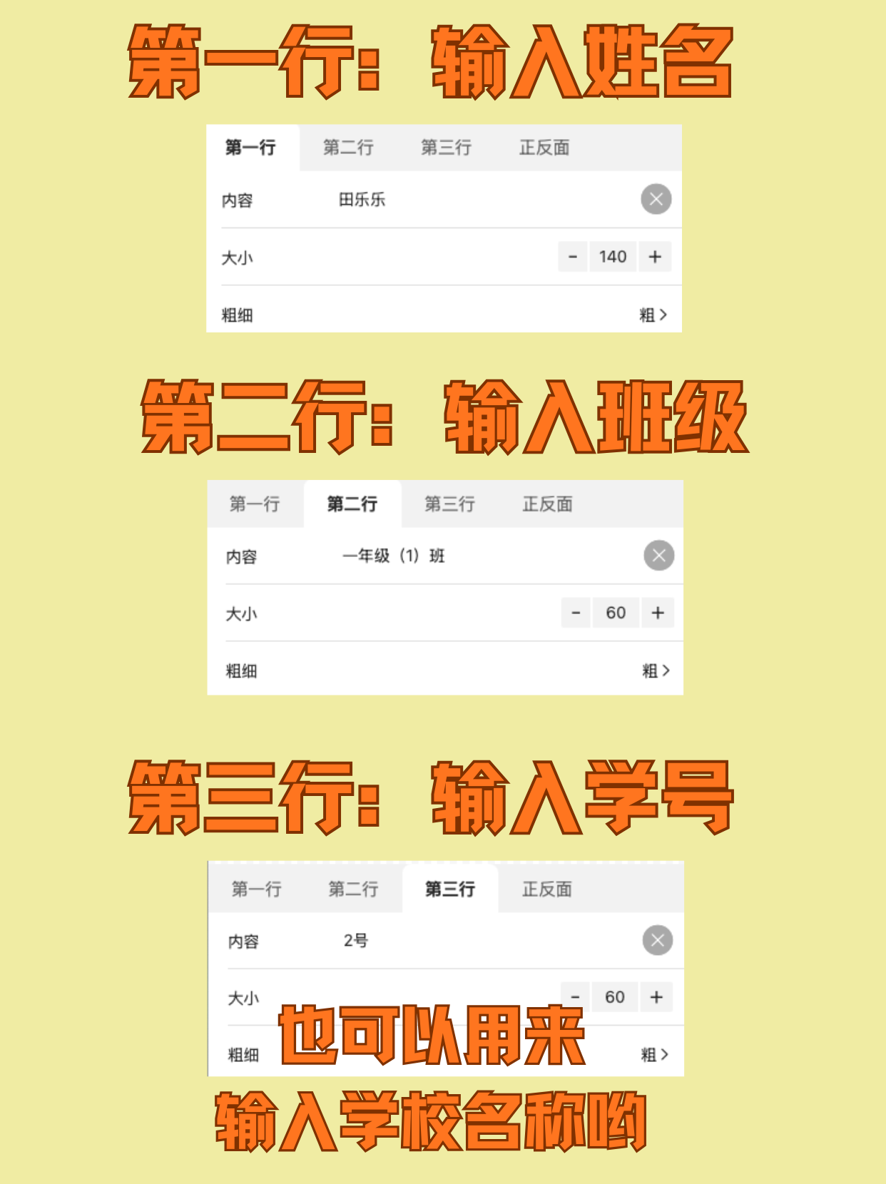 编辑页有三行输入框,常规填写可以第一行填姓名,第二行填班级,第三行填学校。有学号需求的话,直接把第二行或者第三行的内容替换成学号就可以啦。