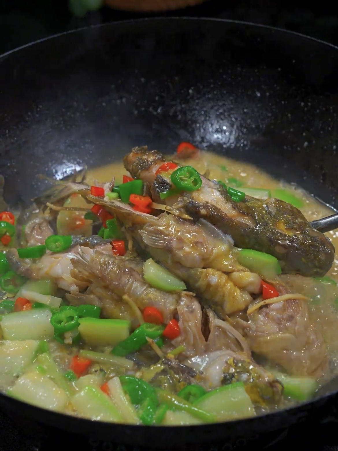 然后起锅烧油,沿着锅边撒下适量的食用盐,再把黄骨鱼放进锅中煎至两面都煎黄后,加入葱白,小米辣,料酒,轻轻翻炒让其入味和去腥增香。再加入切好的丝瓜,倒入适量的开水。最后加入调料:盐,酱油,味精,还有青椒碎,轻轻翻动,煮上2分钟就可以出锅开吃了。