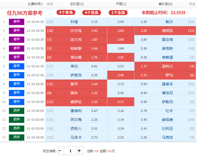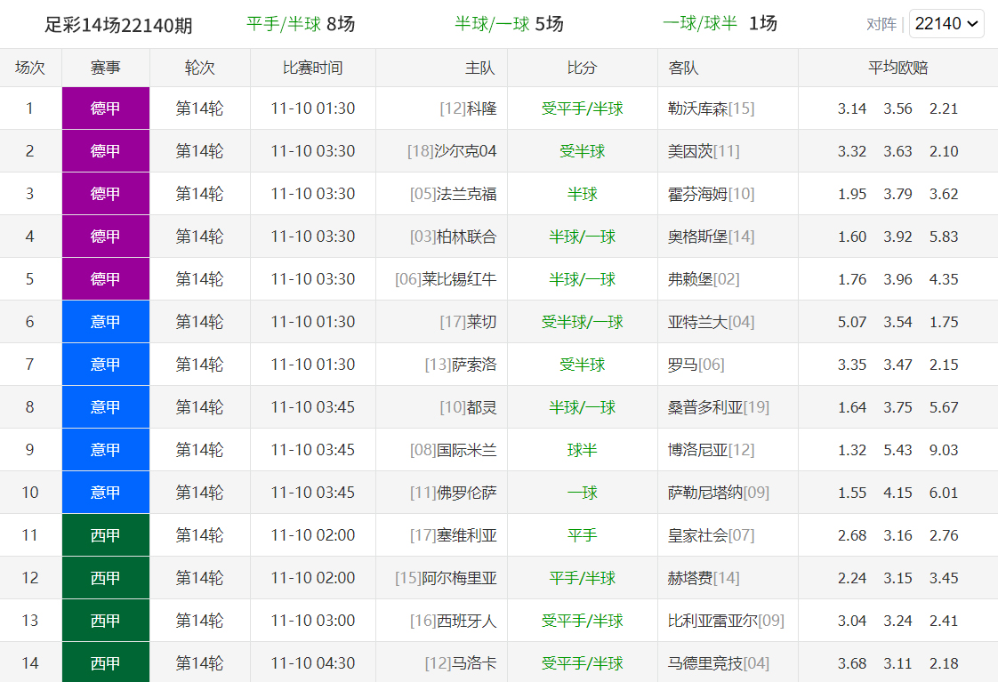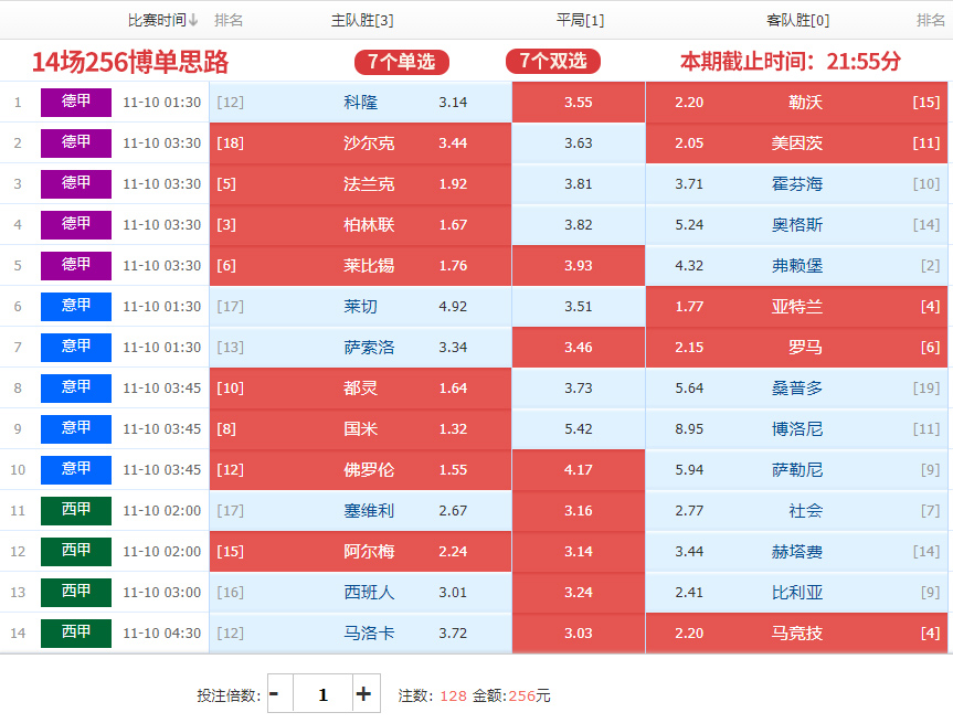 本期平手/半球盘多达8场,半球/一球盘5场,一球/球半盘只有1场;世界杯越来越近了,下周三就开始友谊赛了,今晚和周末还有三期五大联赛比赛的场次,西甲今晚踢完就休赛了;希望大家多往任九选单;任九灵活性高,小单深盘可避开可防范;像昨晚那期就是个机会,英冠避开任九应该不难中;不中也要保持好心态,上期假设英冠深盘打平任九奖金就是千位数了,打出3奖金就是百位数了;世界杯快到了,后面机会还很多,选单思路很关键。本期文章底部分享的是14场256博单,96任九小单;小单命中率有限,谨慎参考,红黑勿怪。祝点赞关注分享转发的粉丝们中大奖!