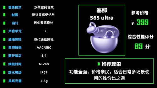 塞 那S 6S ult ra的外观设计简洁,机身颜色搭配时尚,适合年轻人使用。它的佩戴舒适度不错,耳夹采用了高回弹硅胶材质,夹持力适中,能很好地贴合耳廓,单耳重量5.5g,日常佩戴比较轻便,不会有明显的压耳感。