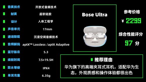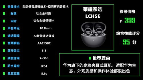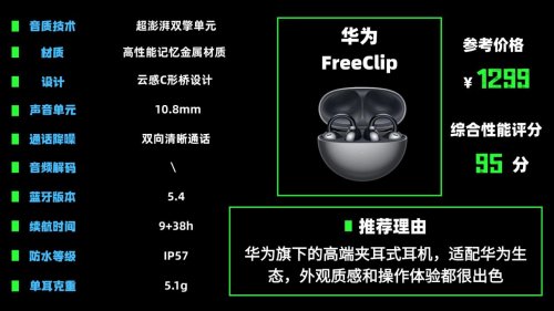 推荐理由:华为旗下的高端夹耳式耳机,适配华为生态,外观质感和操作体验都很出色。