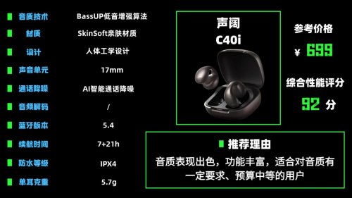 声阔c40i的外观设计简约时尚,机身小巧,佩戴起来很轻便,单耳重量5.3g,耳夹采用了人体工学设计,能很好地贴合耳廓,佩戴稳定性不错,日常运动、通勤都合适。它的材质很亲肤,长时间佩戴也不会有明显的不适感。