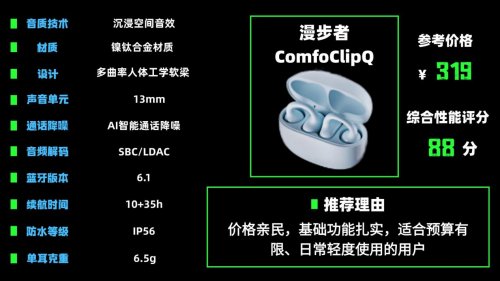推荐理由:“佩戴、音质、AI三旗舰”,业内口碑一直稳居前列,百元耳夹式耳机全能王者!