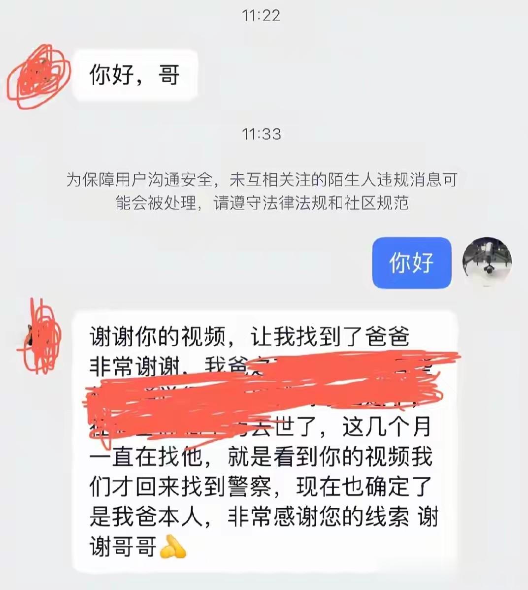 在该网友把视频拍下来发到了网络上,试图通过这种方式找到知情人。果然,很快一个女子联系上了该网友。该女子称,谢谢你的视频,让我找到了爸爸,从女子回复的信息看,她心情非常激动,也十分感激帮她找到了爸爸。