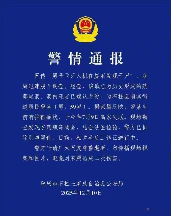 从通报中可以了解到,死者为59岁男子,早在今年的7月9日就离家失联了,而现在还有农药瓶等物品,也是排除民刑事案件。