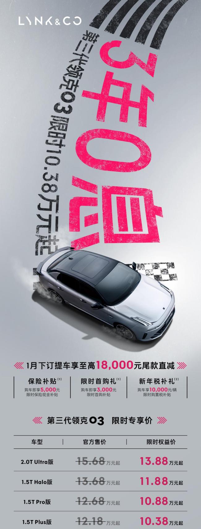 正值1月购车黄金期,领克03家族也适时推出了多项诚意满满的购车福利。其中,第三代领克03限时专享价仅需10.38万起,消费者可以选择“6万2年0息”或“5年贷3年0息”的金融方案,0首付也能轻松申请,大大降低了年轻人的购车门槛。而对于追求极致性能的消费者来说,新领克03+性能进阶版车型更是提供了“2年15万0息”的金融政策,让性能车的梦想触手可及。