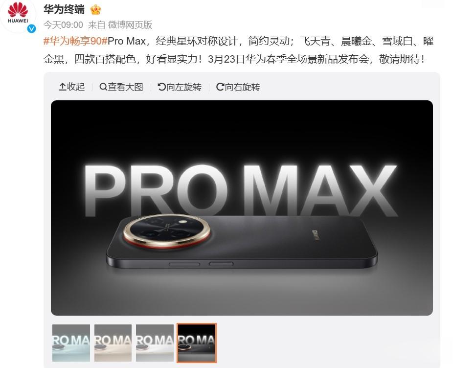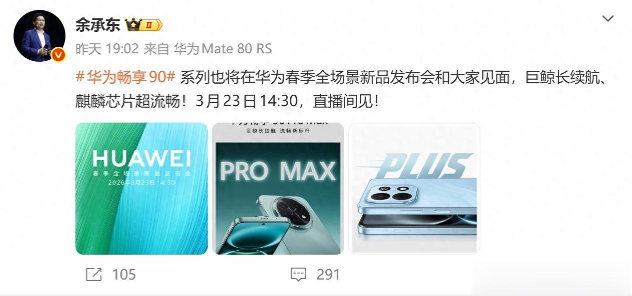 华为畅享90系列手机的发布时间终于确定下来啦!就在3月17日,华华为常务董事、产品投资评审委员会主任、终端BG董事长余承东在其社交平台发布了这款手机的相关信息:3月23日14点30分,直播间见!还有华为终端也在其社交平台上官宣了畅享90系列手机。