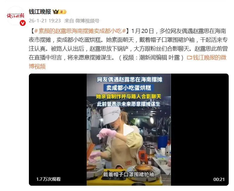 1月20日晚,有网友在海南某夜市偶遇赵露思,这位荧幕上光鲜亮丽的95花,竟化身小吃摊主支起摊位卖起了成都特色蛋烘糕,全程素颜出镜,防护装备拉满,娴熟手法完全看不出是“跨界新手”。这一幕,恰好呼应了她此前直播中“将来愿意摆摊谋生”的坦诚表态,真实不造作的模样圈粉无数。