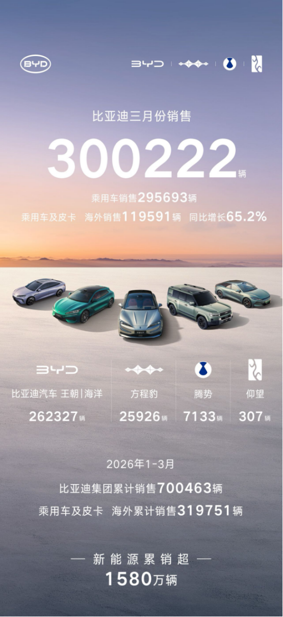 真的炸了!比亚迪刚公布3月销量,单月直接干到300222辆,不仅拿下国内车企销冠,还连续58个月稳坐新能源销量第一,一季度累计卖超70万辆,累计总销量更是突破1580万辆,这势头真没人能挡,比亚迪的对手只剩自己了!