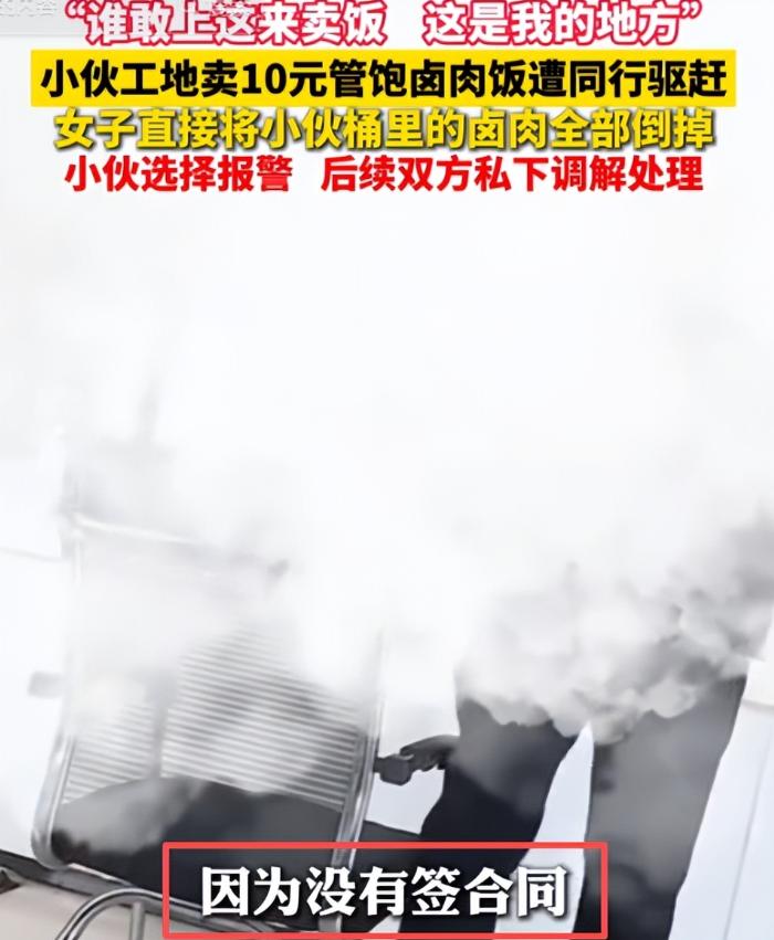 民警当场就明确告诉她,工地门口的公共区域属于公共资源,不是私人的,就算她有食堂承包合同,也没权利损毁别人的财物,更不能限制工友们选哪家的饭吃。