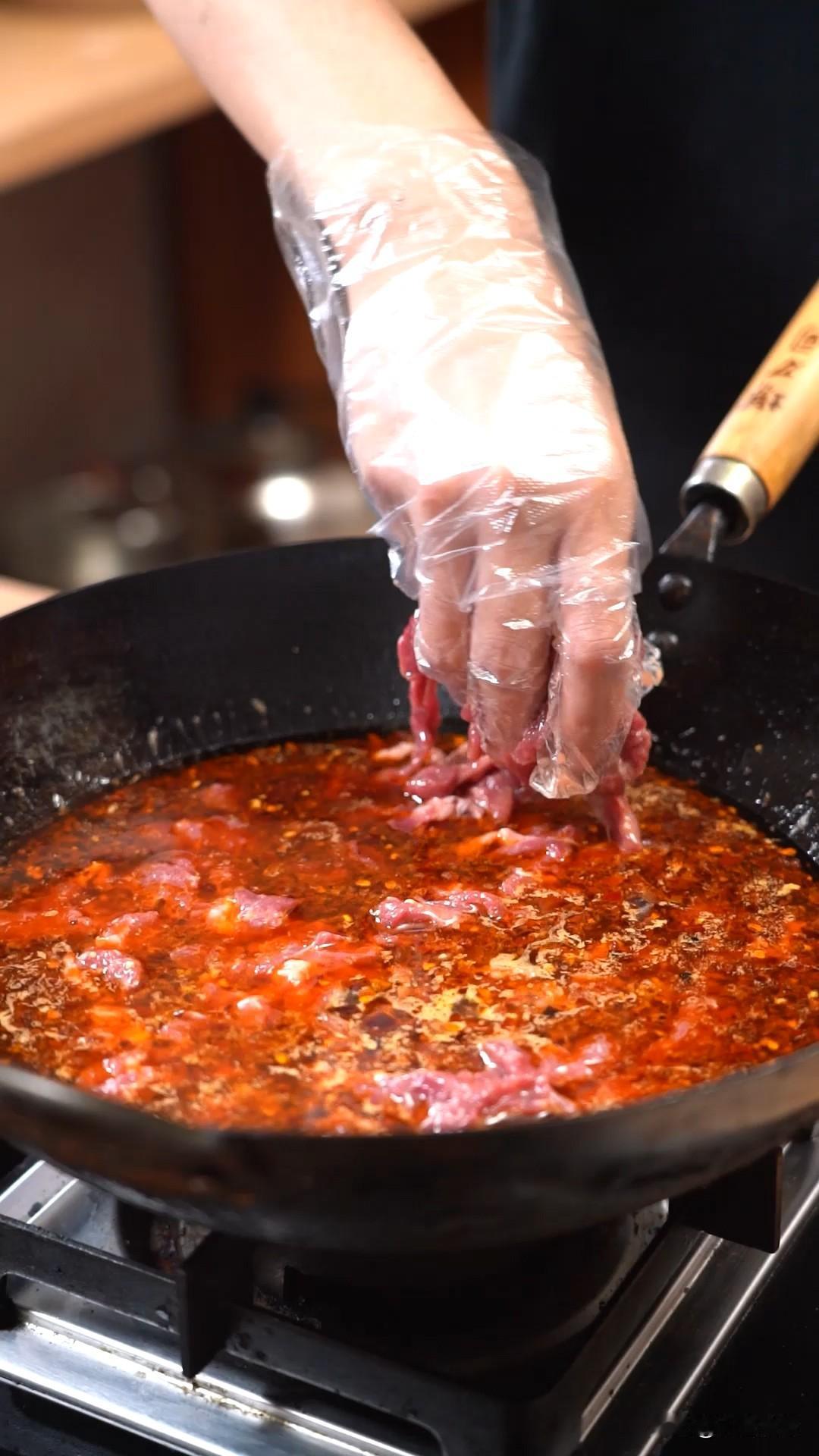 豆花牛肉,第一次吃这道菜的时候,脑子里第一个反应的:水煮牛肉和麻婆豆腐结婚了~~ 今天我自己做豆花,取代原版的嫩豆腐,又辣又麻,又嫩又滑,别有一番风味。川菜爱好者可以试试! 【豆花】 1、黄豆150g提前泡发,加入水1050g打成豆浆,用纱布过滤,接着把豆浆煮开; 2、葡萄糖酸内酯3g加一点点水融化,把热豆浆冲入,静置一会,豆花就做好了。 【刀口辣椒】 花椒和干辣椒放入油锅中炸香,沥出用刀剁碎;(剩下的油等会用来煮菜) 【烹饪过程】 1、腌牛肉:500g牛肉、盐1勺、生抽1大勺、胡椒粉、白糖1勺、葱姜水(少量多次加)、湿淀粉抓起胶,加油封面 2、锅内加入糊辣油,一勺豆瓣酱炒出香味,加入姜蒜末和刀口辣椒炒香,加水煮开; 3、调味:加入鸡精、白糖、生抽,搅拌均匀后,滑入牛肉,用锅铲慢慢推动,变色后勾芡即可倒入装有豆花的碗里; 4、撒上刀口辣椒和蒜末,热油一浇即可 又辣又麻,又嫩又滑,好吃到停不下来的那种。