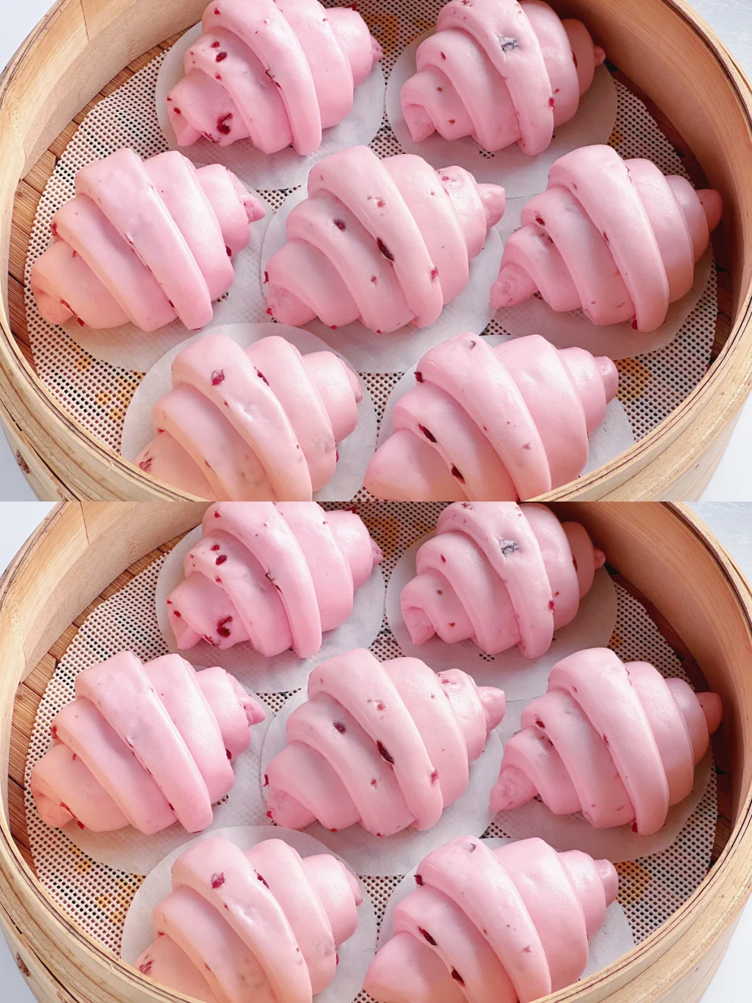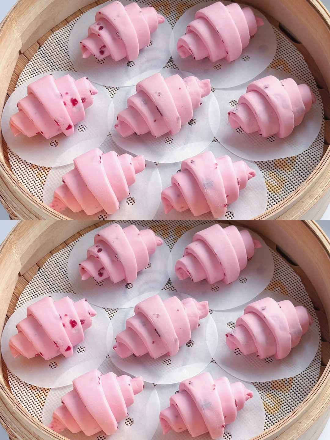 3️⃣取一个从底端开始卷起,整理好的馒头胚放在蒸格上发酵至1.5倍大。发酵完成冷水上锅蒸12分钟焖2分钟即可。