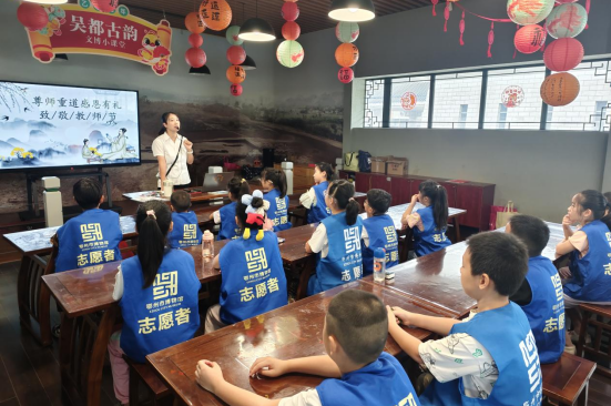 随后,社教老师讲述了中国教育的历史沿革。从夏代祭祀礼射的官学雏形,到春秋时期孔子开创私塾,再到西汉文翁设立官办学校——“石室精舍”,孩子们不仅明白了“教师”身份的古今传承,也更体会到师道尊严的传统美德。