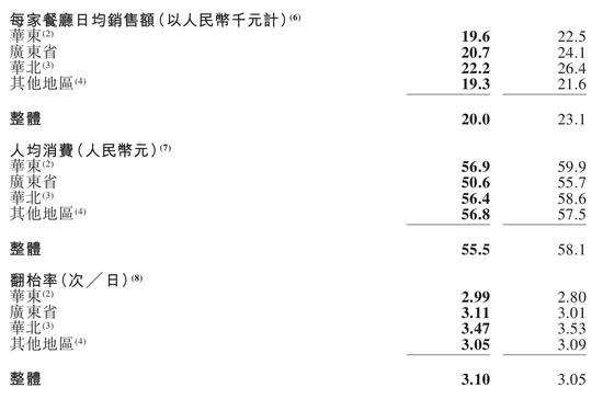 然而,多项核心经营指标则呈现明显下滑趋势。财报数据显示,2025年上半年,绿茶集团同店日均销售额从2024年6月底的2.31万元降至2025年6月底的2万元,降幅达到13.4%。其中,华北地区降幅最大,达15.9%,广东地区次之,降幅为14.1%。
