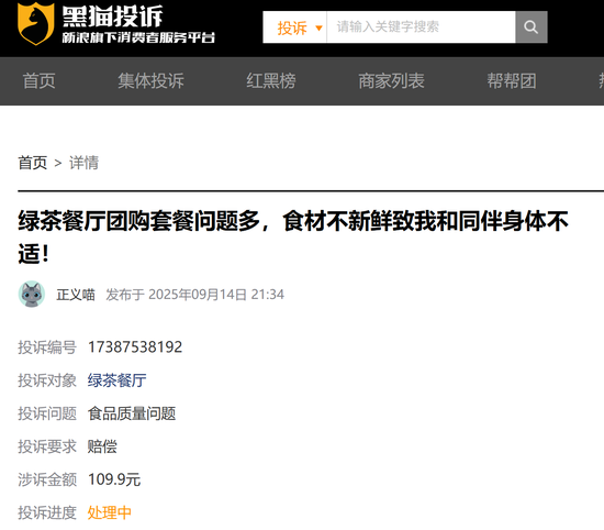 公开资料显示,2021年12月,广州白云第一分公司制售的绿茶餐厅葱香烤鸡被检测出大肠埃希氏菌不符合广东标准;2023年11月,杭州上城分公司的大青椒噻虫胺检测值高于标准值。此外,还有不少消费者在黑猫投诉上反馈,绿茶餐厅存在食品安全问题,部分顾客表示用餐后出现身体不适。