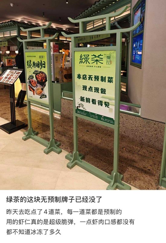 在这场风波中,曾被证监会问询预制菜占比的绿茶餐厅成为消费者新的质疑焦点。据广东、浙江多地的网友爆料,绿茶餐厅此前曾高调宣传“无预制菜,现点现做”,不过近日门店却将广告牌悄然撤下。