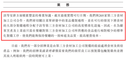 不同于西贝的模式,绿茶集团未自建中央厨房,食材依赖外部供应商。绿茶集团在招股书中曾披露,公司与205家第三方食材加工公司合作。绿茶将食材的大部分制备过程分配给第三方食材加工公司,因此在上菜前餐厅只需要对供应食品进行较少的工序,包括部分招牌菜。