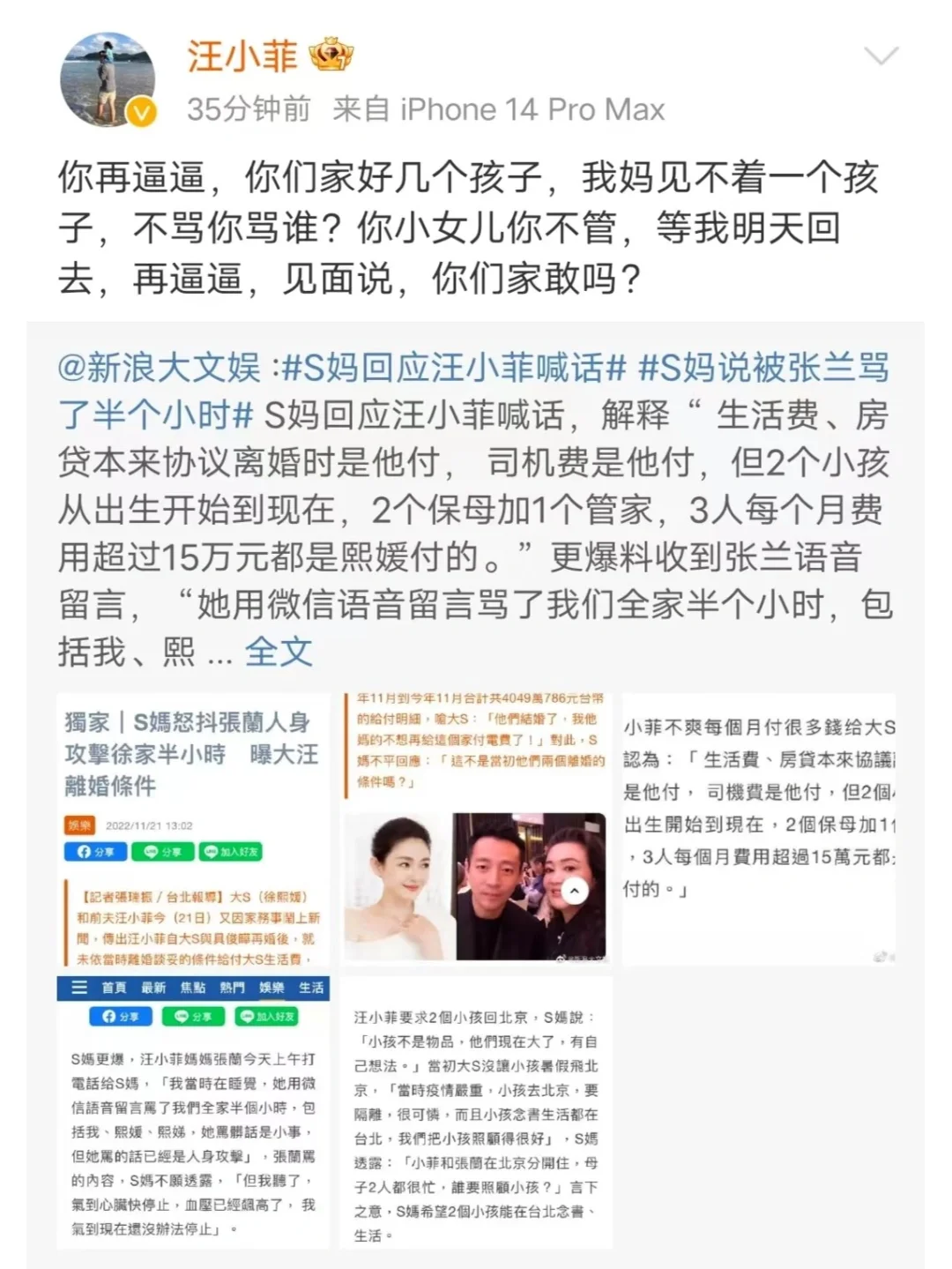 汪真的证明了男性也有发疯文学。 每个月必闹一次,跟大型狗血伦理剧似的。 太抓马太搞笑太疯狂了。 有没有觉得他很像一些文学作品里的“疯女人”形象,事实证明发疯不是女性专属,男人发起疯来杀伤力和破坏力更胜一筹。 不由得又想起当年他和张雨绮感情破裂现场互扇巴掌。 当时可能还被传为一则圈内言情文学。 现在真的除了好笑和好笑,再没有其他观感了。 希望大小S越来越好,可能会催生更多男性发疯文学。