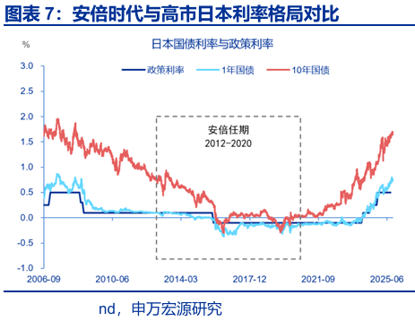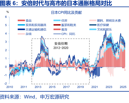 高市与安倍面临的经济环境已差异显著,安倍时期全球低通胀、低利率为安倍经济学创造了顺风环境。2012年12月安倍上任时,日元处于强周期中,日元升至1美元兑84日元左右,挤压出口与企业利润;2025年10月,日元已跌至150附近;2010年代,日本深陷通缩阴影,2014–2016全球油价暴跌,形成输入性通缩压力。2025年,日本已经历了疫情后通胀回升、工资上行;安倍2013推出QQE,2016推出负利率并引入YCC,目标是把通胀锚向2%;2025年,日央行已退出负利率并上调政策利率。经济环境的差异,使得相似的财政、货币刺激在安倍时期更专注于抗通缩,而在高市时期则要兼顾抑制通胀与金融稳定。