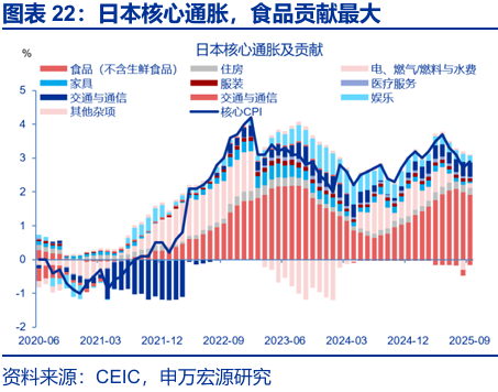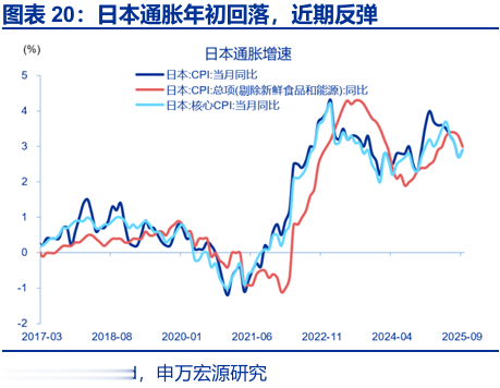 日本通胀反弹风险上升,明年薪资增速预期较强,日元贬值压力均可能制约明年日央行鸽派空间。今年以来,日本通胀先回落,后趋稳,9月再度抬升。结构上,食品通胀偏强,能源由拖累转向拉动,商品通胀走弱,服务通胀粘性较强。9月日本CPI同比2.9%,核心CPI(除生鲜)同比2.9%,二者均反弹,9月核心-核心(除生鲜与能源)CPI同比3.0%。食品仍然是最稳定的拉动项,9月不含生鲜食品同比7.6%,拉动日本核心CPI增速达1.9个点;政府电气补贴在9月退坡,导致能源通胀增速由8月的-4%升至9月的1.9%;9月服务通胀同比1.4%,与年初增速整体持平;9月商品通胀增速4.2%,较1月的6.3%回落。展望明年,薪资和汇率均可能构成通胀压力。2025年春斗薪资增速最终结果5.25%,为34年来最高,用工紧缺与最低工资上调带动下,2026年仍可能有5%的薪资增幅。今年日元在150上下波动,若日元延续走弱,或抬升通胀预期,参考日本财务省测算,日元贬值10%约抬升通胀0.3个百分点。