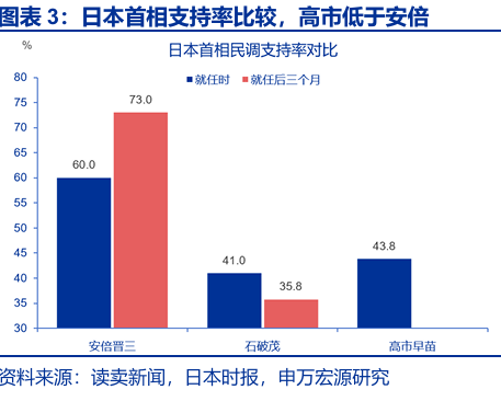 另一方面,高市的支持率偏低。安倍2012年就任时支持率达60%,就任后3个月支持率升至73%,属于日本政界少见的强势开局。超高支持率给予了其在货币与财政上扩张的政治底气。但高市早苗的支持率明显弱于安倍,参考10月日本时报的调查,高市支持率仅为43.8%。