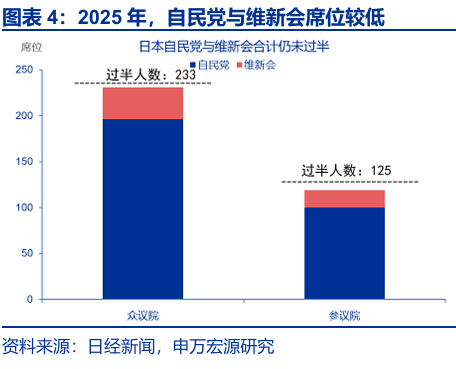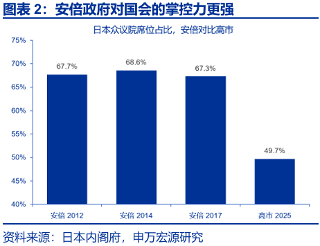高市早苗存在政治约束,政策推行能力可能低于安倍。一方面,执政党在国会的优势走弱,法案通过难度更大。安倍2013年后形成两院的稳定多数局面,结束了“扭曲国会”,在众议院长期占比达2/3,即便参议院反对,普通法案也能凭众议院三分之二强行通过,这是安倍推动多轮预算外刺激(2013年、2019年)、安保法制(2025)通过的硬性保障。但在2025年,自民党在众议院为196席,与维新会联合执政后,总数231席,距离过半仍差2席,参议院也无多数优势,高市早苗的普通立法通过难度大于安倍时期。
