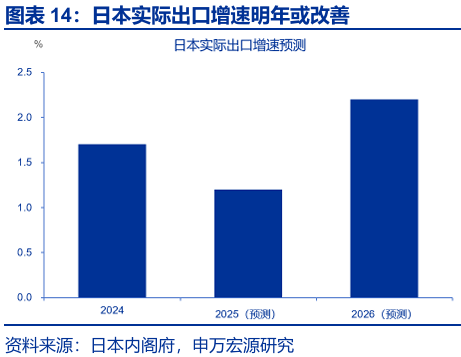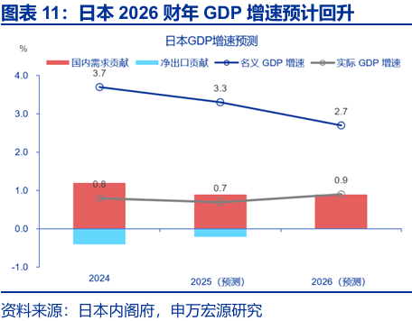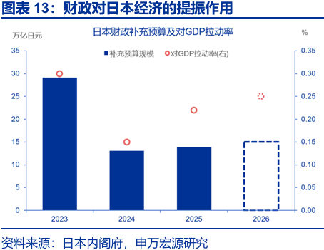日本明年实际经济增速或小幅提升至0.9%,财政刺激对经济的拉动率小幅上升。参考日本内阁府预测,2025日本实际GDP增速0.7%,2026升至0.9%,增长的主要贡献来自内需,日本私人消费温和升至1.1%;净出口在2025年因关税冲击拖累经济增长,2026年出口增速或加快至2.2%,对GDP的贡献恢复至0%。财政对明年日本经济的作用小幅提升,高市早苗推进的补充预算可能超过去年的13.9万亿日元,对GDP的拉动效果或在0.25%左右,小幅高于去年。