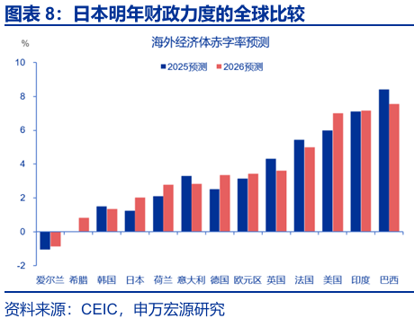 日本明年赤字率水平仍较低,但增幅扩大。2025年日本赤字率为1.3%,在发达经济体中处于较低位置,2026年,日本赤字率或抬升至2.0%,相比于美国、法国仍较低。但若从增量角度看,明年日本赤字率或走阔约0.77个点,仅低于美国、德国、希腊,高于欧元区、法国等。