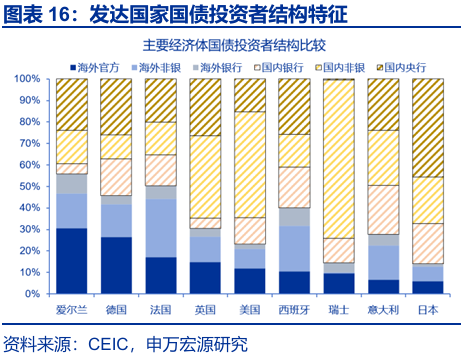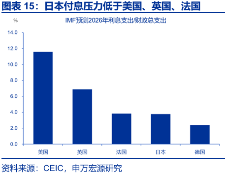 日本债务存量极大,流量层面债务风险相对较低,短期仍有财政扩张空间,但付息压力在抬头。日本政府债务占GDP比重在发达经济体中最高,但因外债低、债务久期长、央行与本土机构持有为主,暴发债务风险的概率相对较低。参考IMF的预测,2026年美国利息支出占GDP预计达到4%,英国2.9%、法国2.2%,日本1.5%,德国1.2%。从利息支出/政府总支出看,2026年美国预计为11.59%、英国6.89%、法国3.83%、日本3.77%、德国2.41%。日本低于美国、英国,压力相对较低。但日央行仍处于加息周期,导致日本付息压力倾向上行。日债市场买家结构存在一定的抗风险能力,截至2024年末,日本央行持有日债比例45.5%、境外占比14%,低于美国、法国、英国等,日本的股债汇三杀风险也同样相对较低。