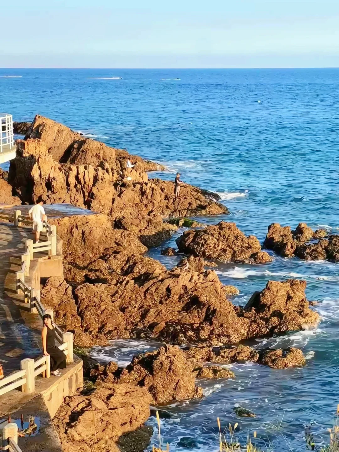 我更喜欢日落之前色调,黄黄的礁石蓝色的大海和半红色的天绝美