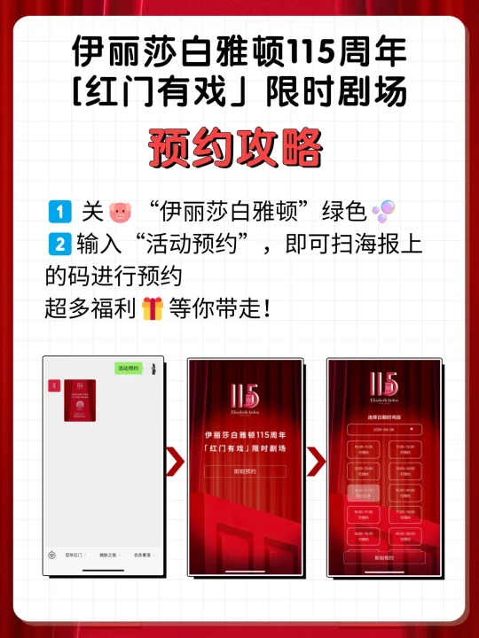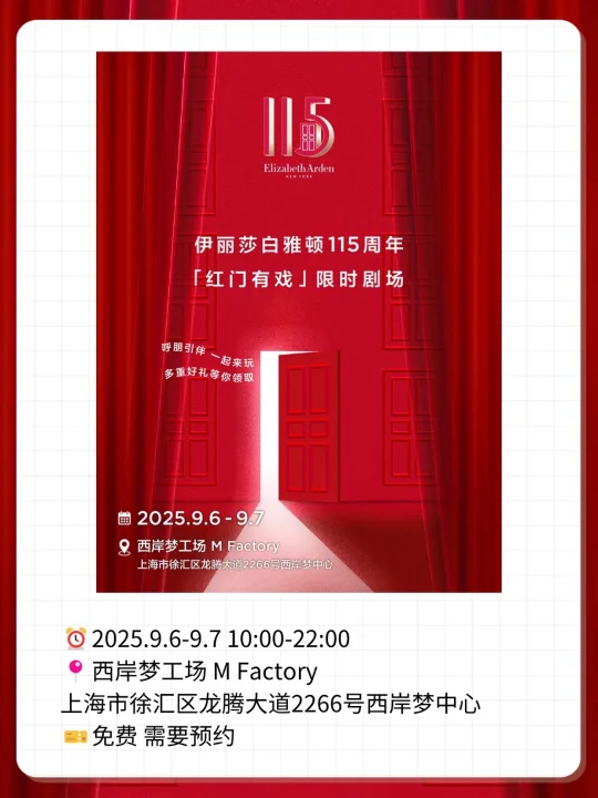 伊丽莎白雅顿带着双重王炸里程碑--115周年品牌庆+胶囊系列 35 周年纪念,直接把西岸梦工场变成「红门有戏」限时剧场,这波梦幻联动必须冲爆📸! 邀请你沉浸式体验有趣有戏的红门戏幕,每个角落都藏着反转彩蛋,每个场景都超级出片 ⚠️关键信息速码 ⏰ 时间:2025.9.6-9.7(10:00-22:00) 📍 地址:西岸梦工场 M Factory(徐汇区龙腾大道 2266 号) ps. 建议搭配红色系OOTD,📷超出片! 具体预约攻略看图3哦! 现场超多福利🎁等你!