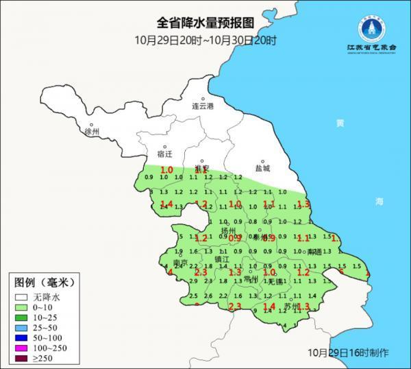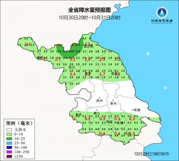 10月30日20时至10月31日20时,沿淮和淮北地区阴有小雨,局部雨量中等。苏南地区阴有小雨并渐止转多云。