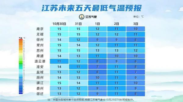 未来几天,最低温悄悄下滑,后期大部分城市最低气温,逐渐回落到个位数,11月3日苏州的最低气温跌至12℃。