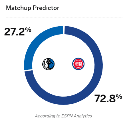 ESPN预测明日活塞vs独行侠比赛:活塞胜率高达72.8%