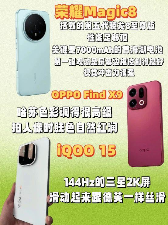 标准版旗舰大乱斗!线下摸完这四台,我的钱包捂不住了… 今天溜进线下店,把热度爆表的四台标准版旗舰都摸了个遍!分别是iQOO 15、OPPO Find X9、vivo X300和荣耀Magic8。作为标准版爱好者,就来聊聊第一眼感受吧! iQOO 15:上手第一感觉就是为速度而生。店员演示了游戏超分超帧,画面确实流畅到没朋友。144Hz的三星2K屏滑动起来跟德芙一样丝滑,而且7000mAh电池带来的安全感十足,玩游戏再也不怕没电了。 OPPO Find X9:背面那个绒砂玻璃后盖,手感绝了,完全不沾指纹。重点试了拍照,哈苏色彩调得很高级,拍人像时肤色自然红润,背景虚化也很到位。7025mAh的冰川电池容量让人安心。 vivo X300:6.31英寸左右的机身(注:搜索结果中未明确vivo X300标准版尺寸,此为vivo X300 Pro的参考尺寸)握在手里小巧精致,单手操作无压力。和蔡司联名的2亿像素影像实力不俗,拍了一张店里的多肉植物,叶片上的绒毛都清晰可见。 荣耀Magic8:第一眼观感是屏幕边框控制得极好,视觉冲击力很强。搭载的第五代骁龙8至尊版性能足够顶,关键是7000mAh的青海湖电池,店员小哥说正常用能顶一天多,彻底告别电量焦虑。 对我这种不喜欢带充电宝的懒人来说,荣耀Magic8在性能、屏幕、手感都一流的基础上,那种“你随便用,电量管够”的踏实感,真的是线下体验后最戳我的点。就选它了!荣耀Magic8 荣耀Magic8Pro