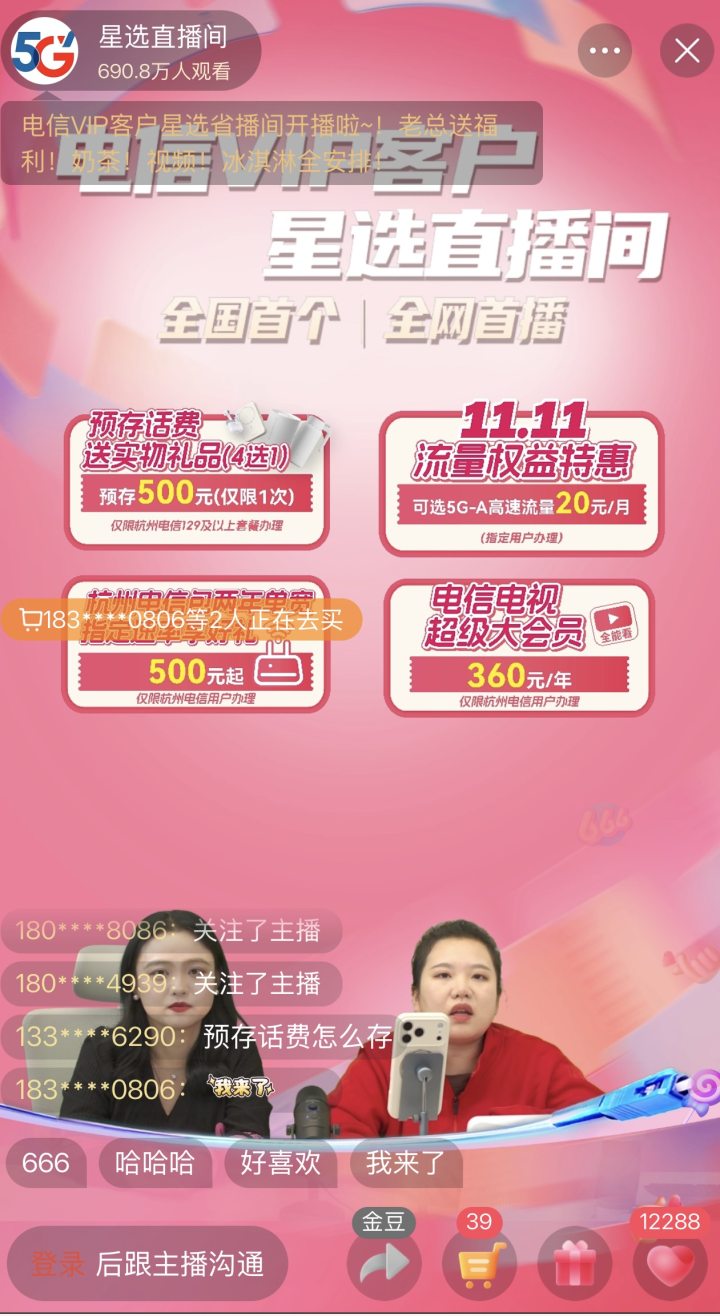 昨日(11月11日),中国电信“翼启星程,焕心同行”——全国首个“星选直播间”宠粉首播活动,在武林营业厅直播运营中心3楼5G-A演播厅正式启幕并圆满收官。这场横跨白昼至深夜的直播嘉年华,以14.5小时超长续航(数字人主播直播接力至24:00)的创新形式,打造“线上直播带货+线下市集体验”双场景模式,凭借全品类供给、多维度服务与重磅福利矩阵,为百万星级用户送上专属礼遇,更标志着电信在用户服务升级与数字化转型领域迈出突破性一步。