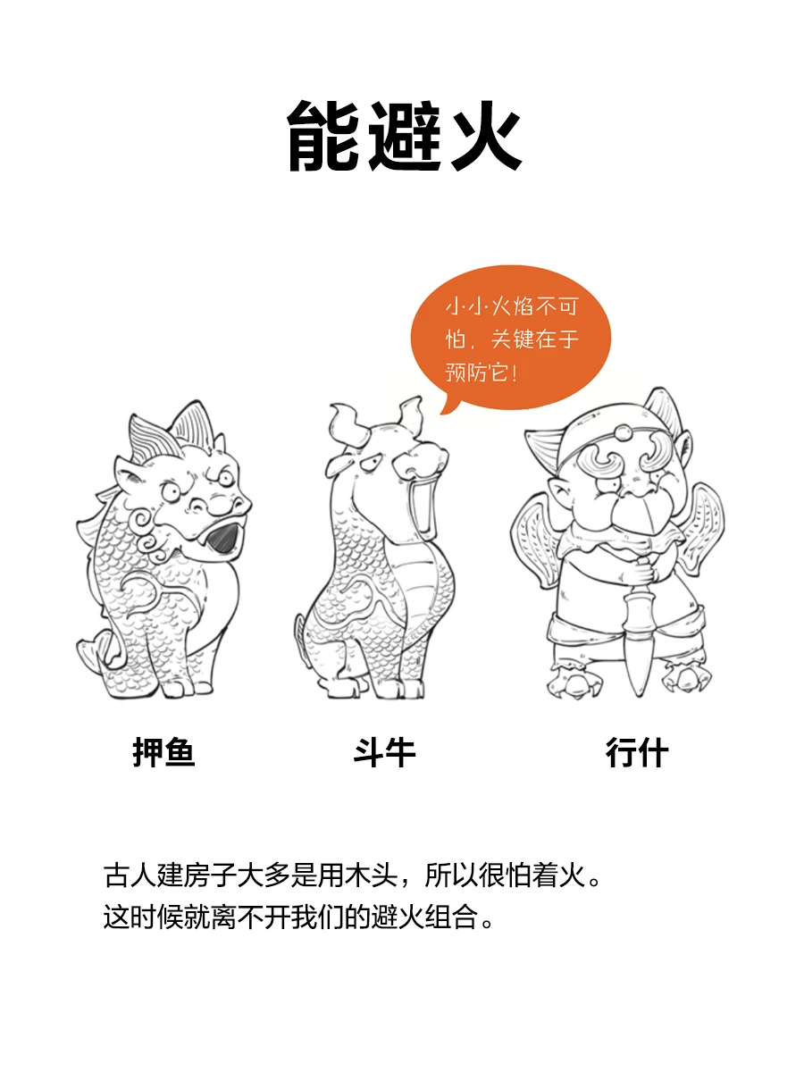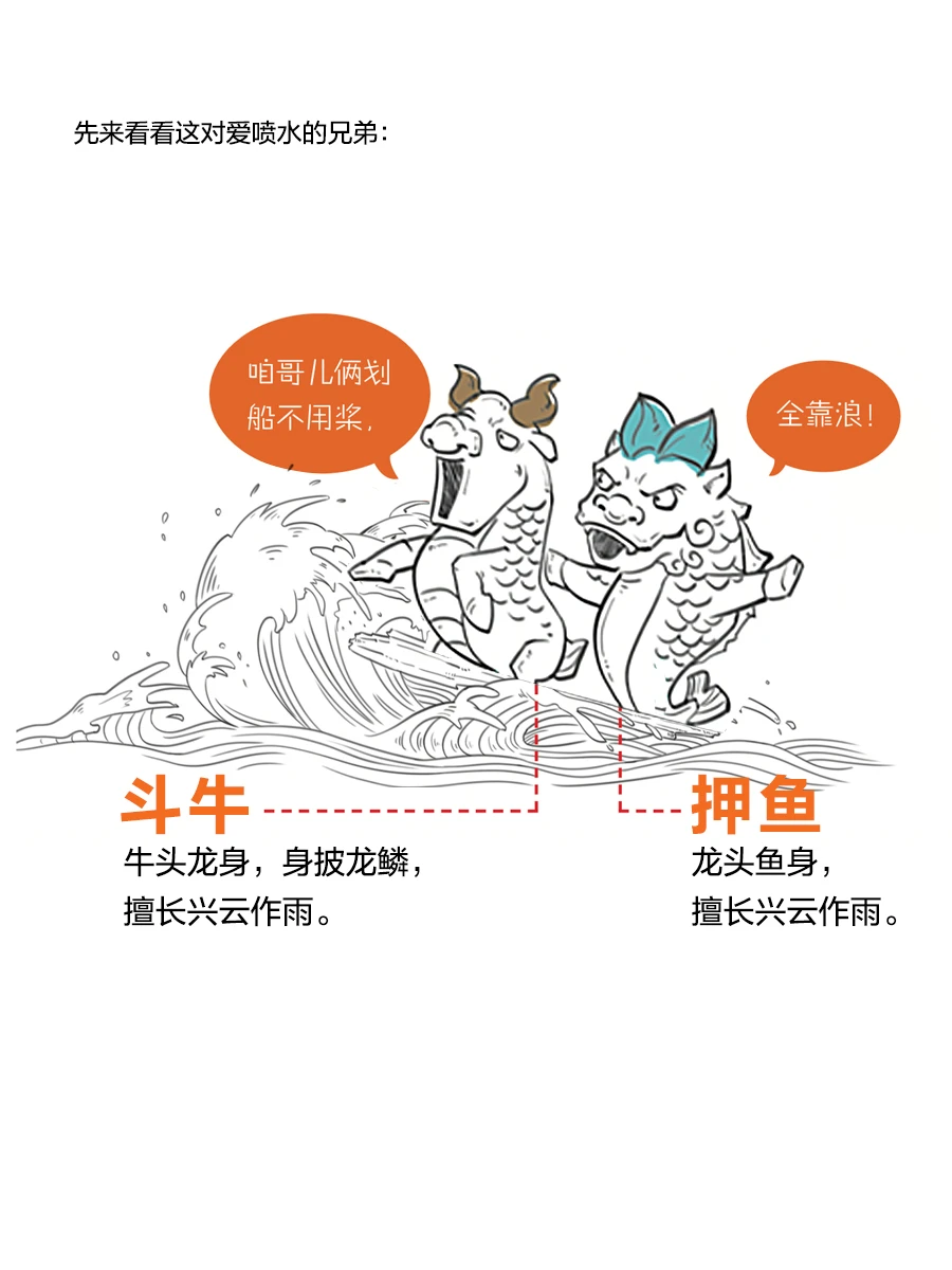 狎鱼:浑身有麟,身后有明显的鱼尾巴。喜静不喜动,爱好烟火,护佑平安。