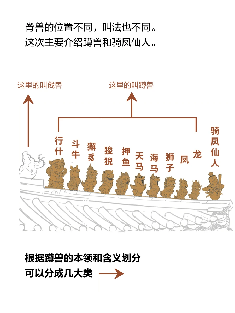 垂脊上的小兽从下往上依次是骑凤仙人(不算脊兽)、龙、凤、狮子、天马、海马、狻猊、狎鱼、獬豸、斗牛、行什。