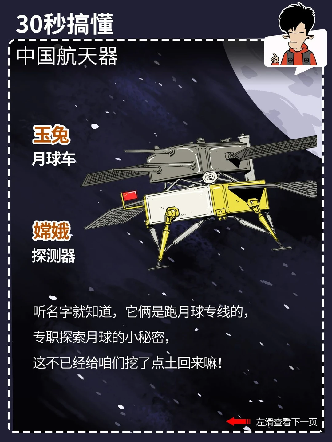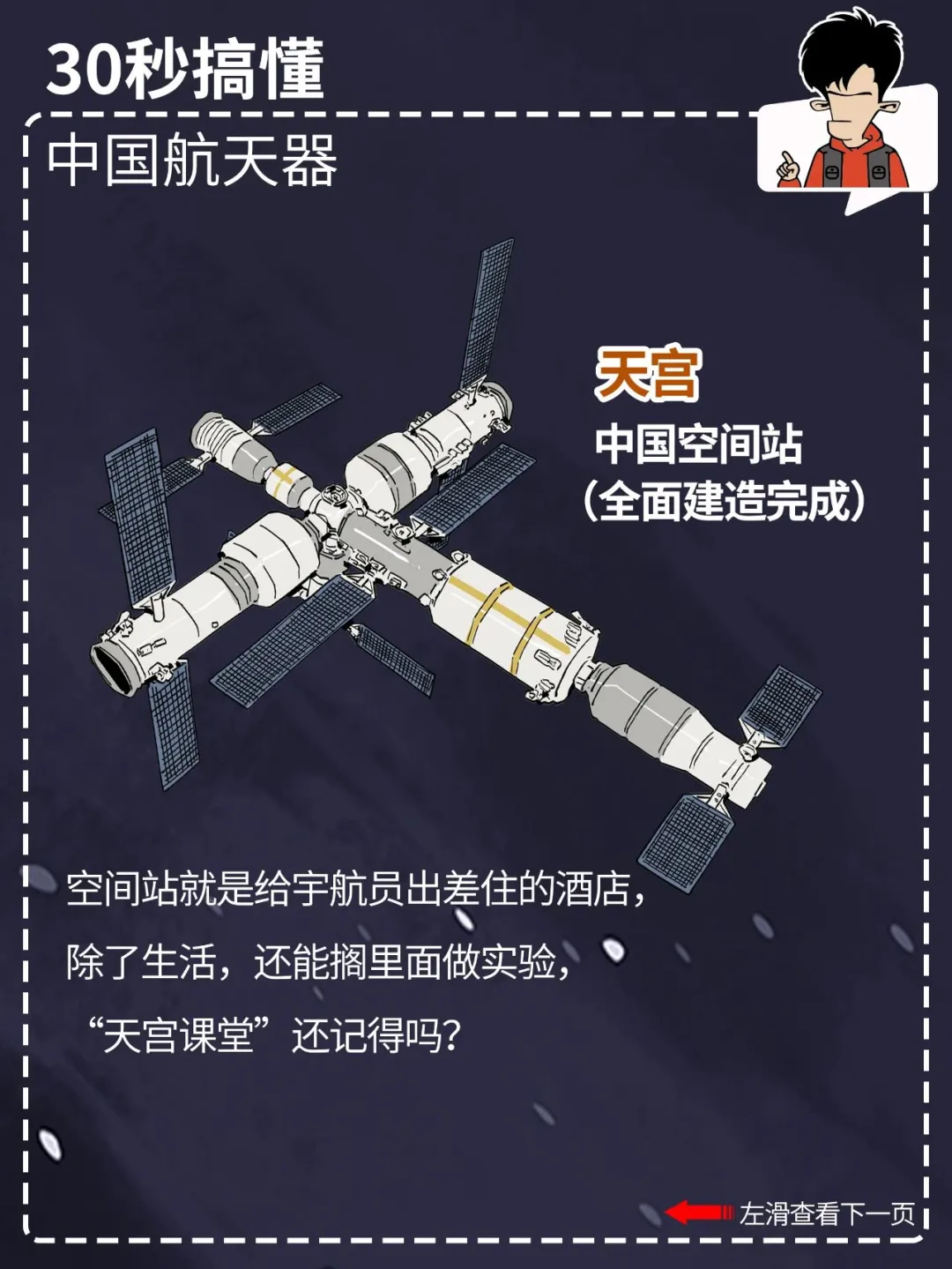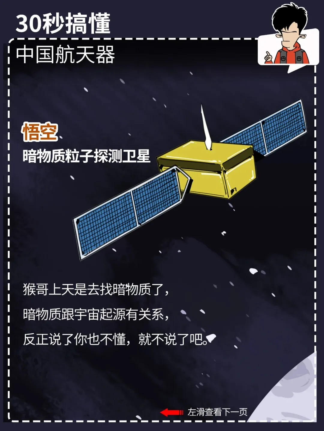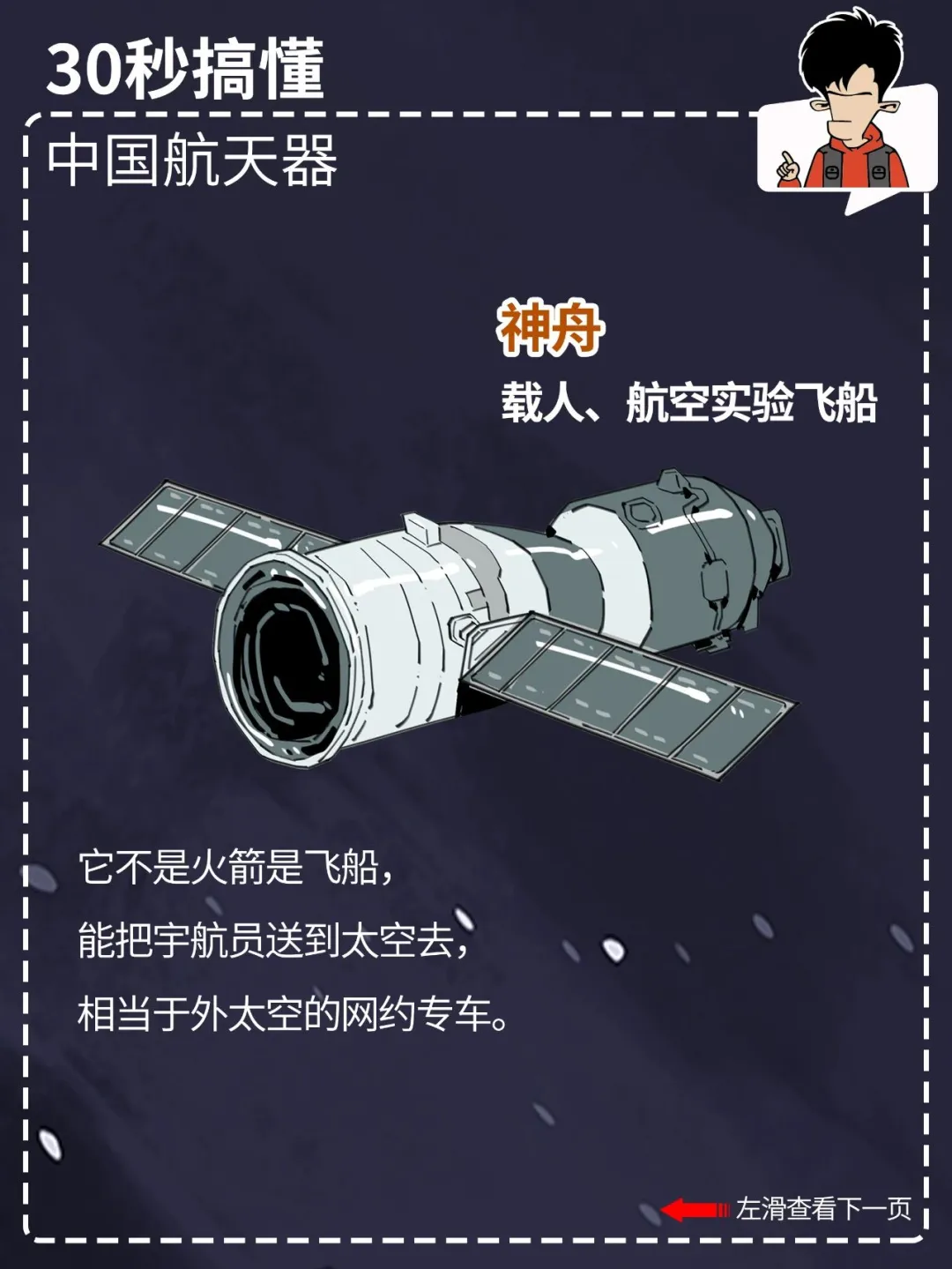 都看新闻了吗? 就在今天,中国航天人又双叒叕搞大喜事,神舟十七号发射圆满成功! 咱中国的航天事业发展得这么好,外太空里一堆航天器: 什么嫦娥、巡天、天问、北斗、悟空、墨子、天宫……你光知道神舟可不够。 混子哥用 30 秒,带你搞懂各种中国航天器都是干啥的。 点击图片,看清晰大图,方便保存、转发。