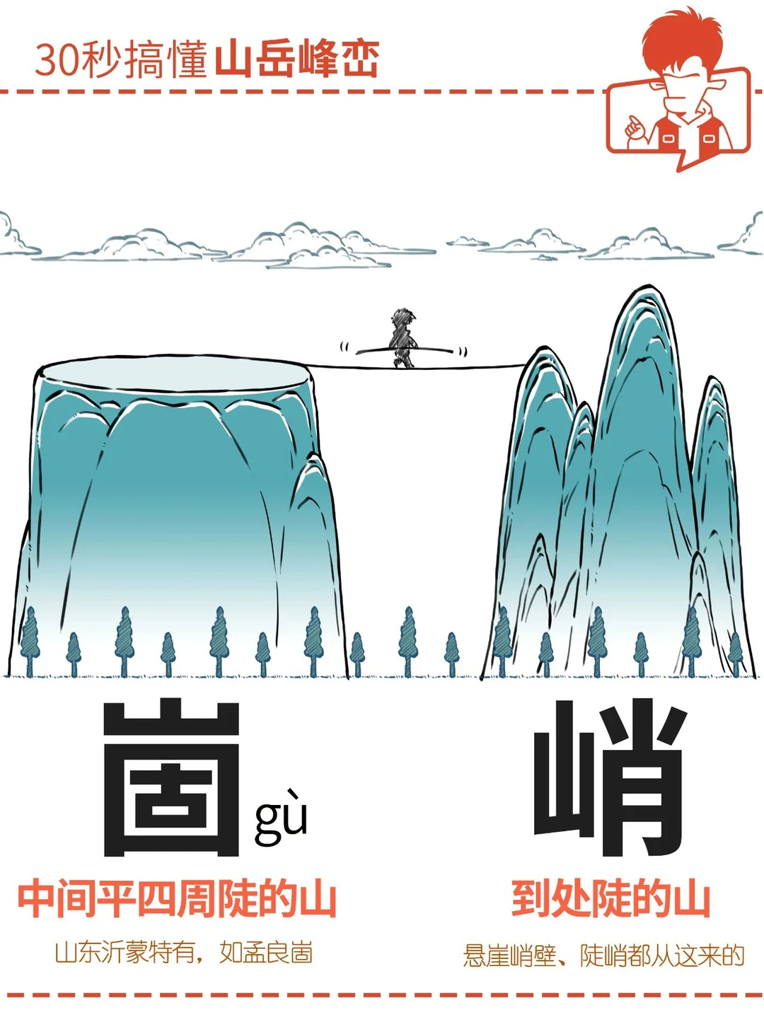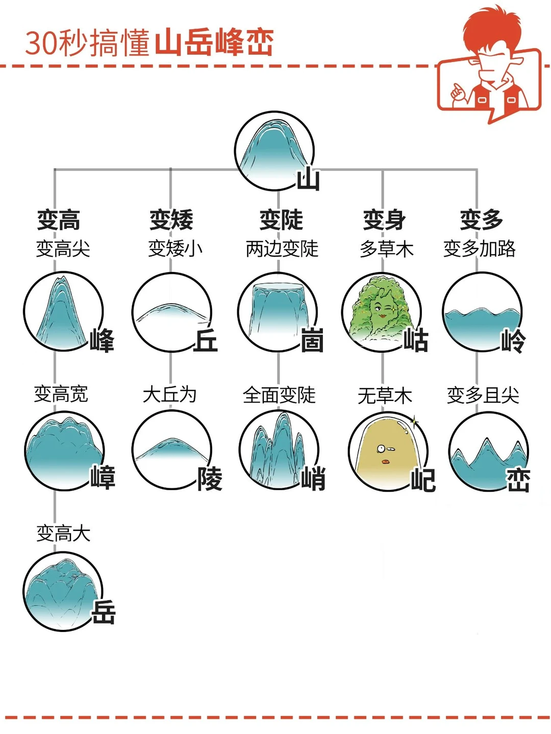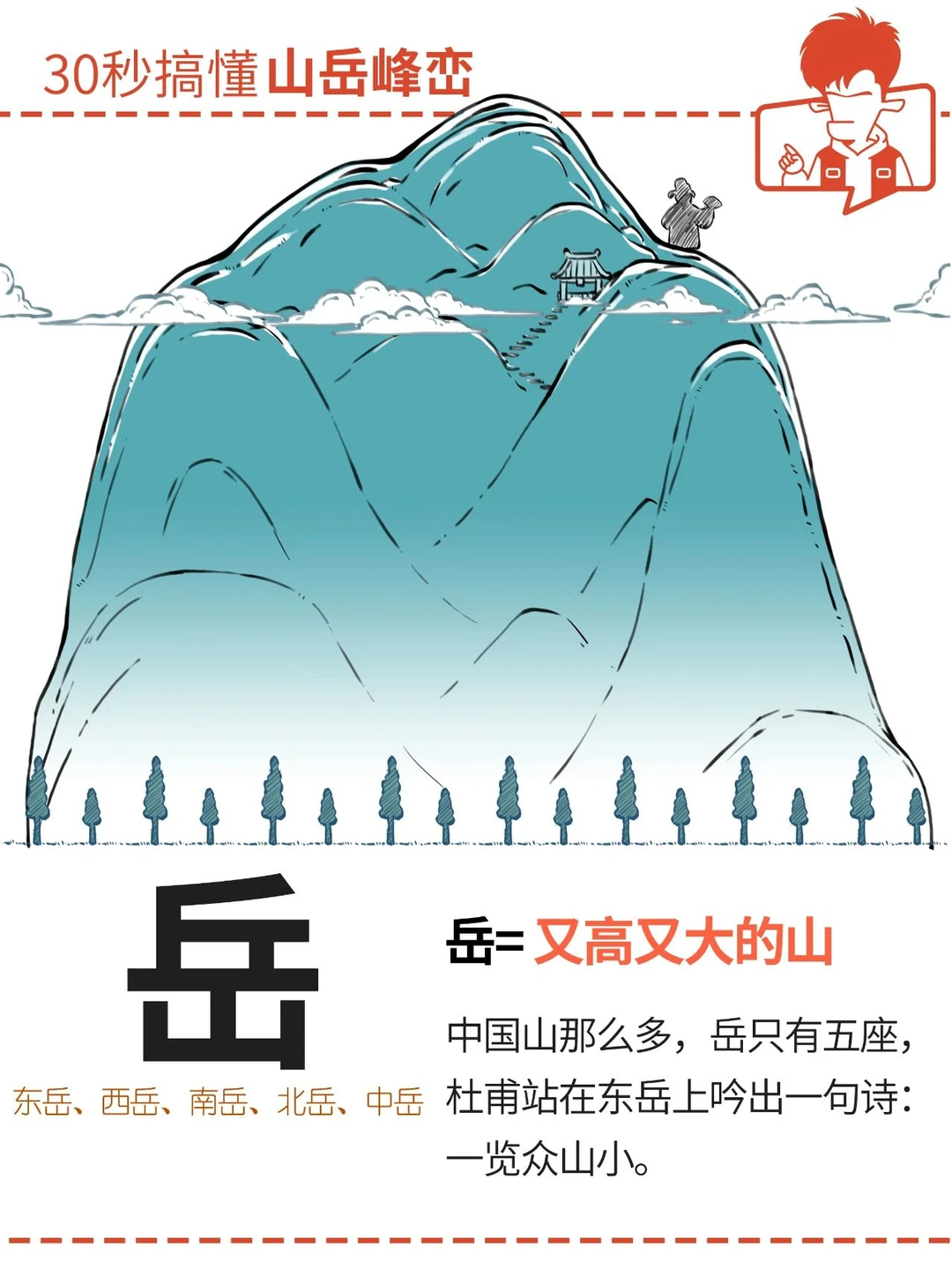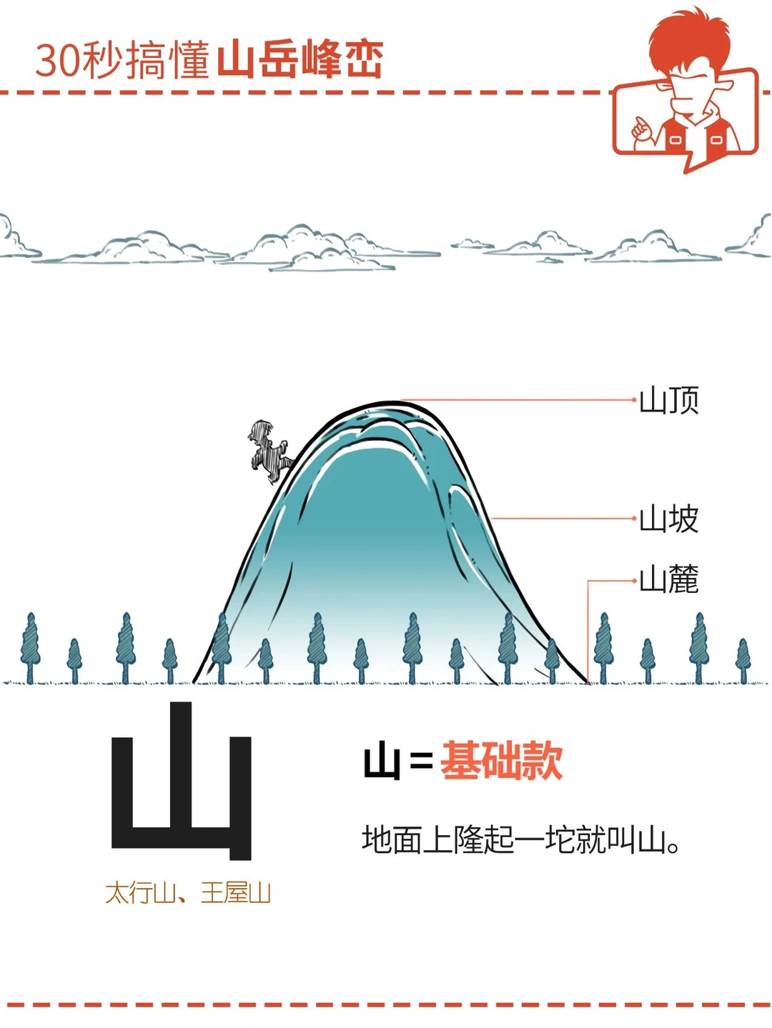 我国是一个多山的国家, 许多省份都有自己出圈的名山, 古代帝王们对山充满了崇拜和敬畏, 现在人们户外旅行, 也把爬山当作必打卡的运动项目。 但是你有没有想过一个问题: 同样都是山,为啥有的叫岳,有的叫峰? 还有峦、嶂、丘、陵、崮、峭等等, 它们究竟有啥区别呢? 今天混子哥就用 30 秒,带你搞懂 12 种山。 让你出门旅游更显文化。 点击图片,看清晰大图,方便保存、转发。 转载请注明出处。