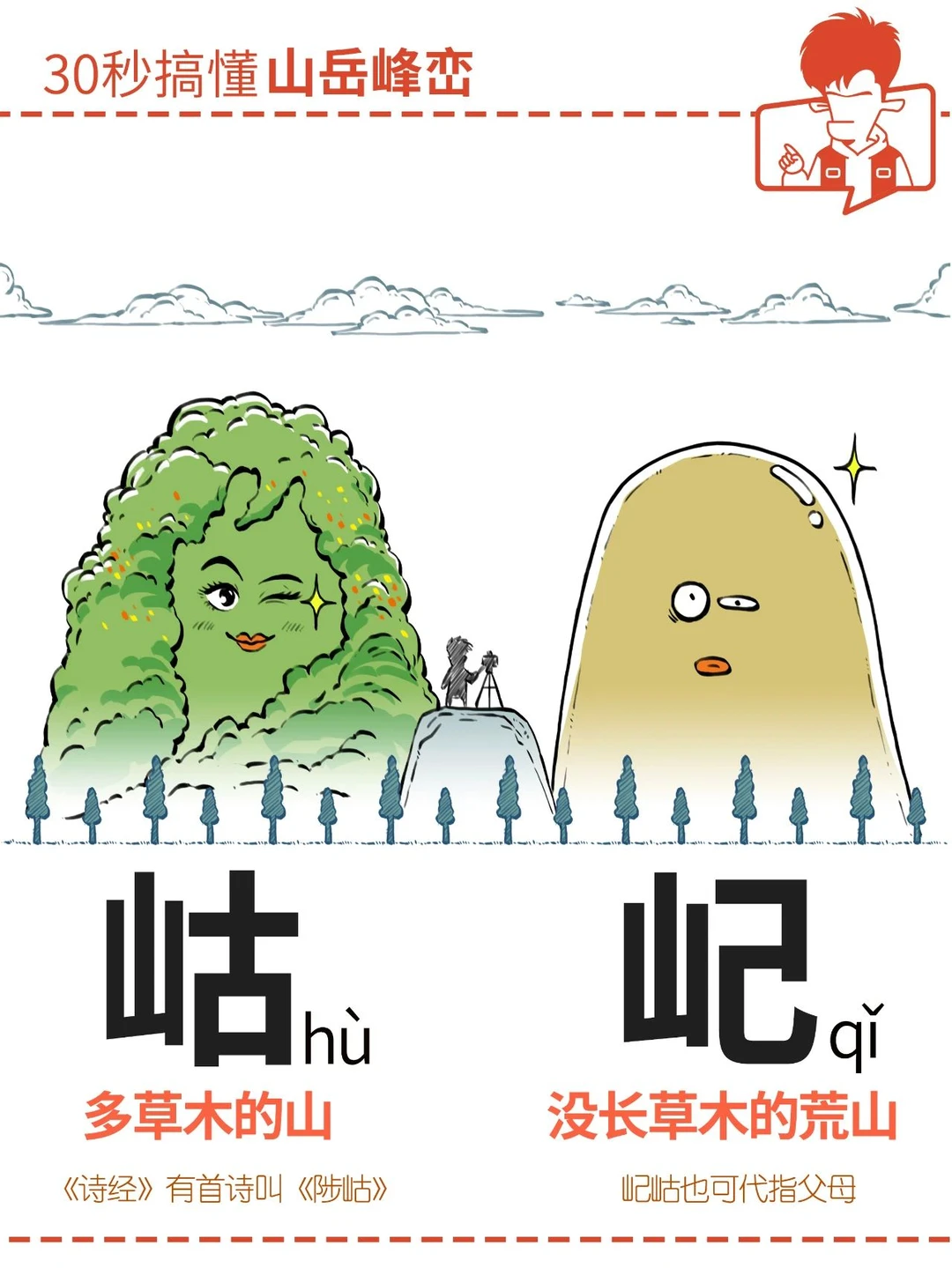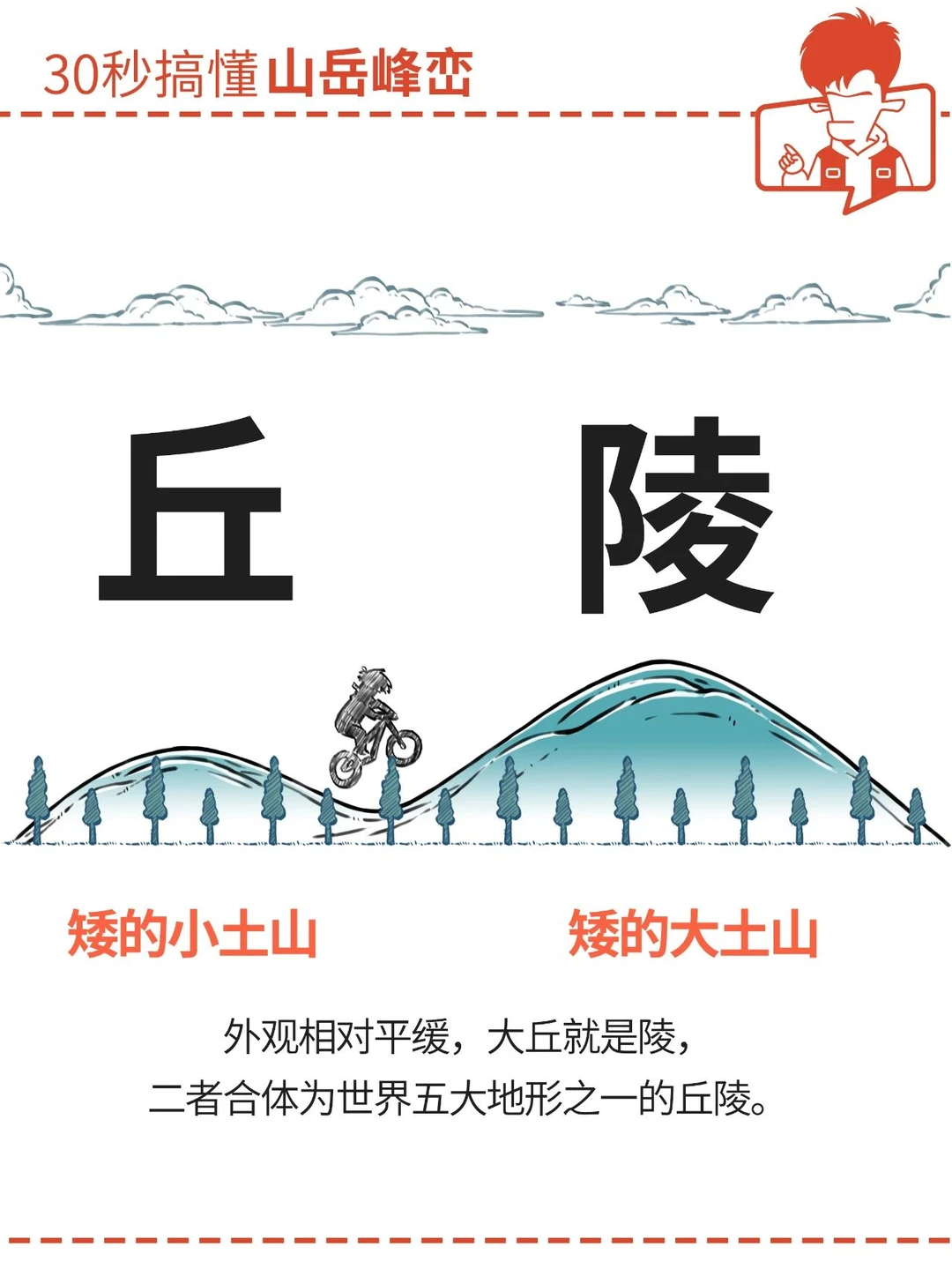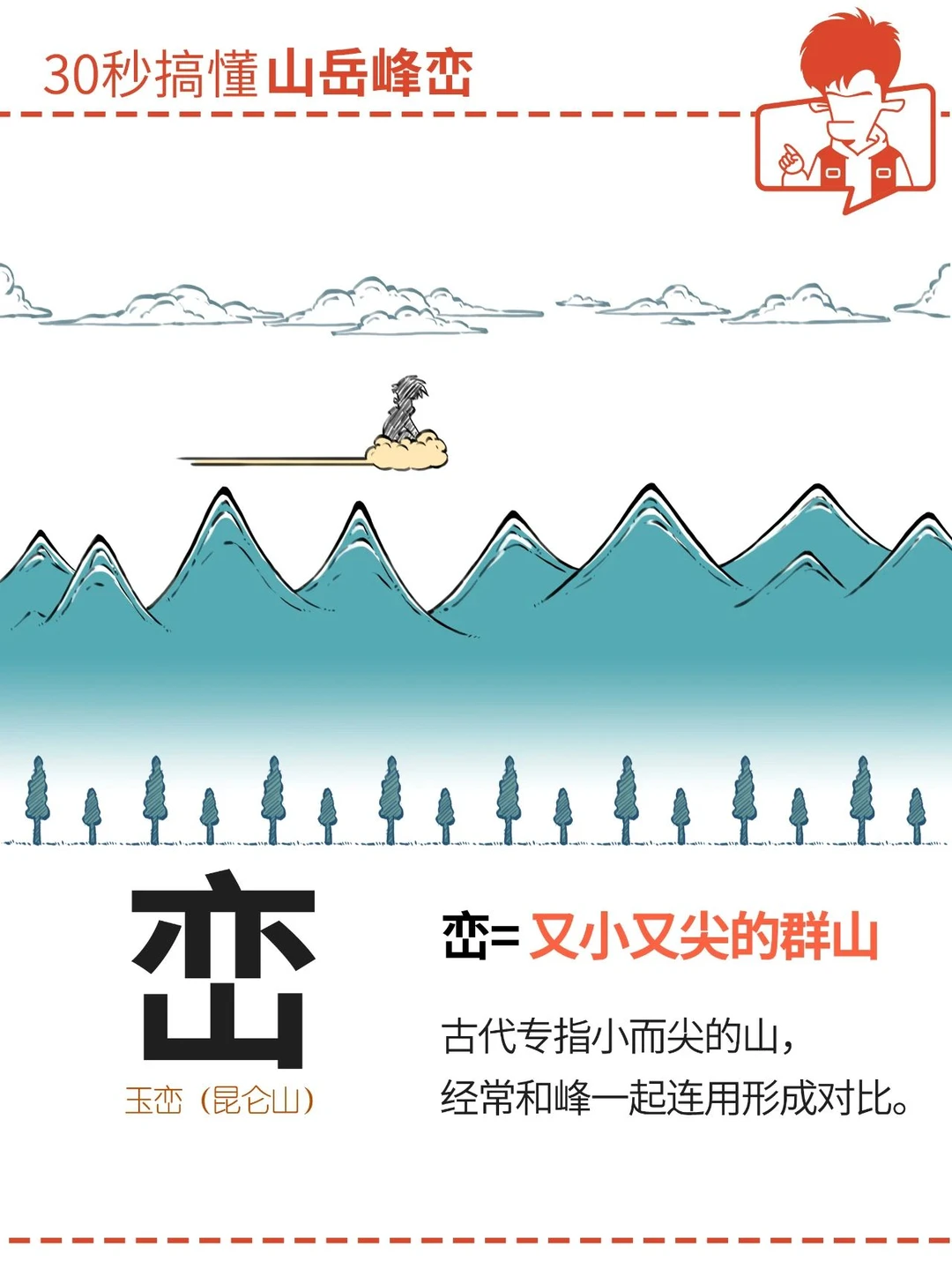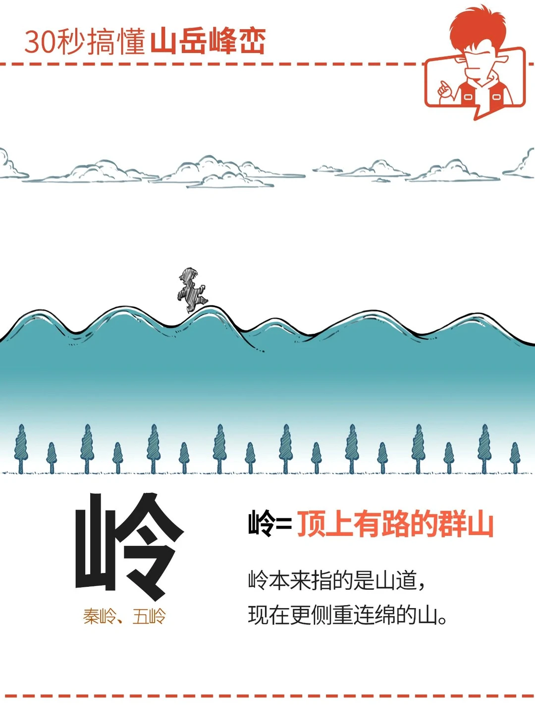 我国是一个多山的国家, 许多省份都有自己出圈的名山, 古代帝王们对山充满了崇拜和敬畏, 现在人们户外旅行, 也把爬山当作必打卡的运动项目。 但是你有没有想过一个问题: 同样都是山,为啥有的叫岳,有的叫峰? 还有峦、嶂、丘、陵、崮、峭等等, 它们究竟有啥区别呢? 今天混子哥就用 30 秒,带你搞懂 12 种山。 让你出门旅游更显文化。 点击图片,看清晰大图,方便保存、转发。 转载请注明出处。