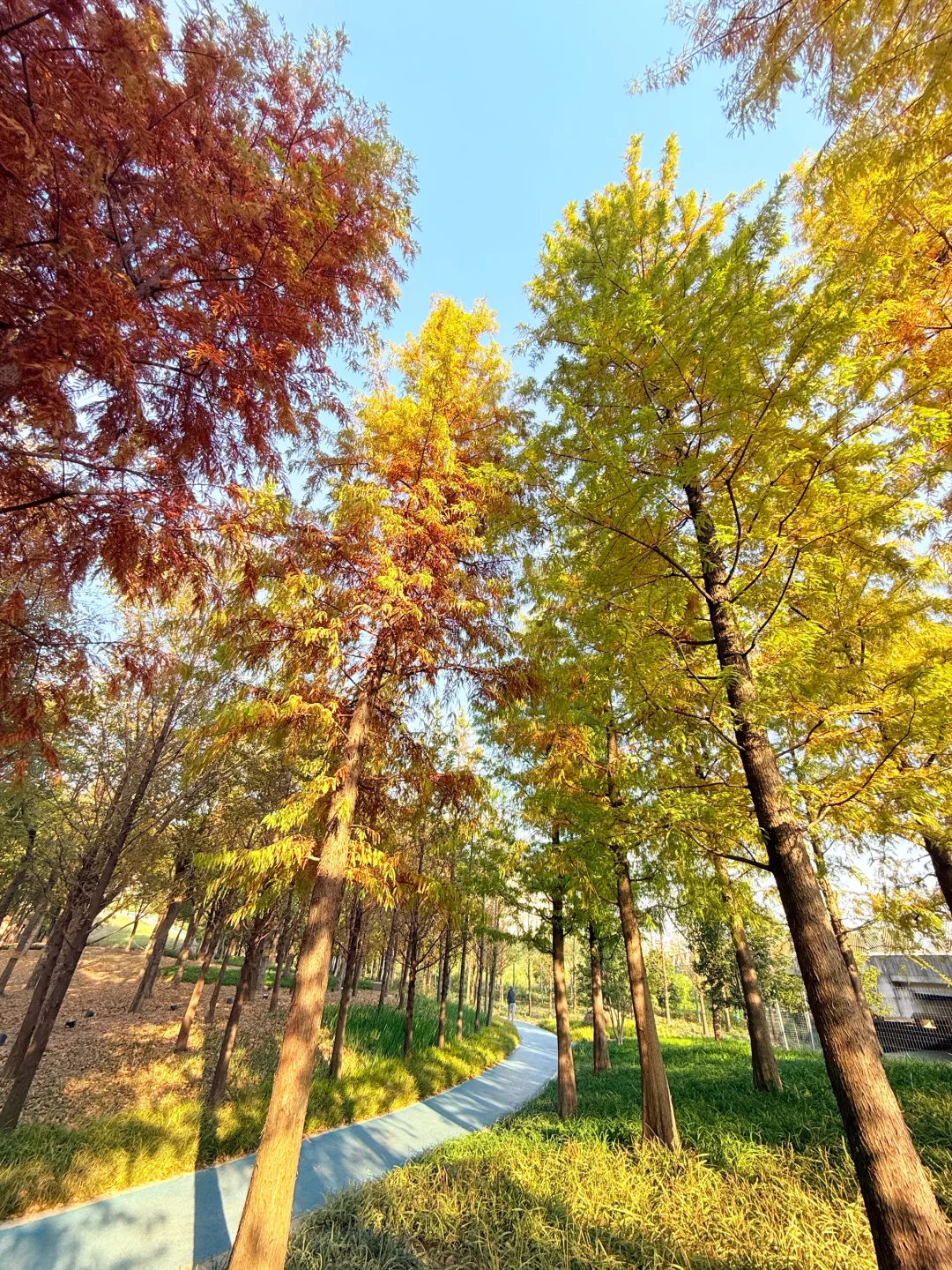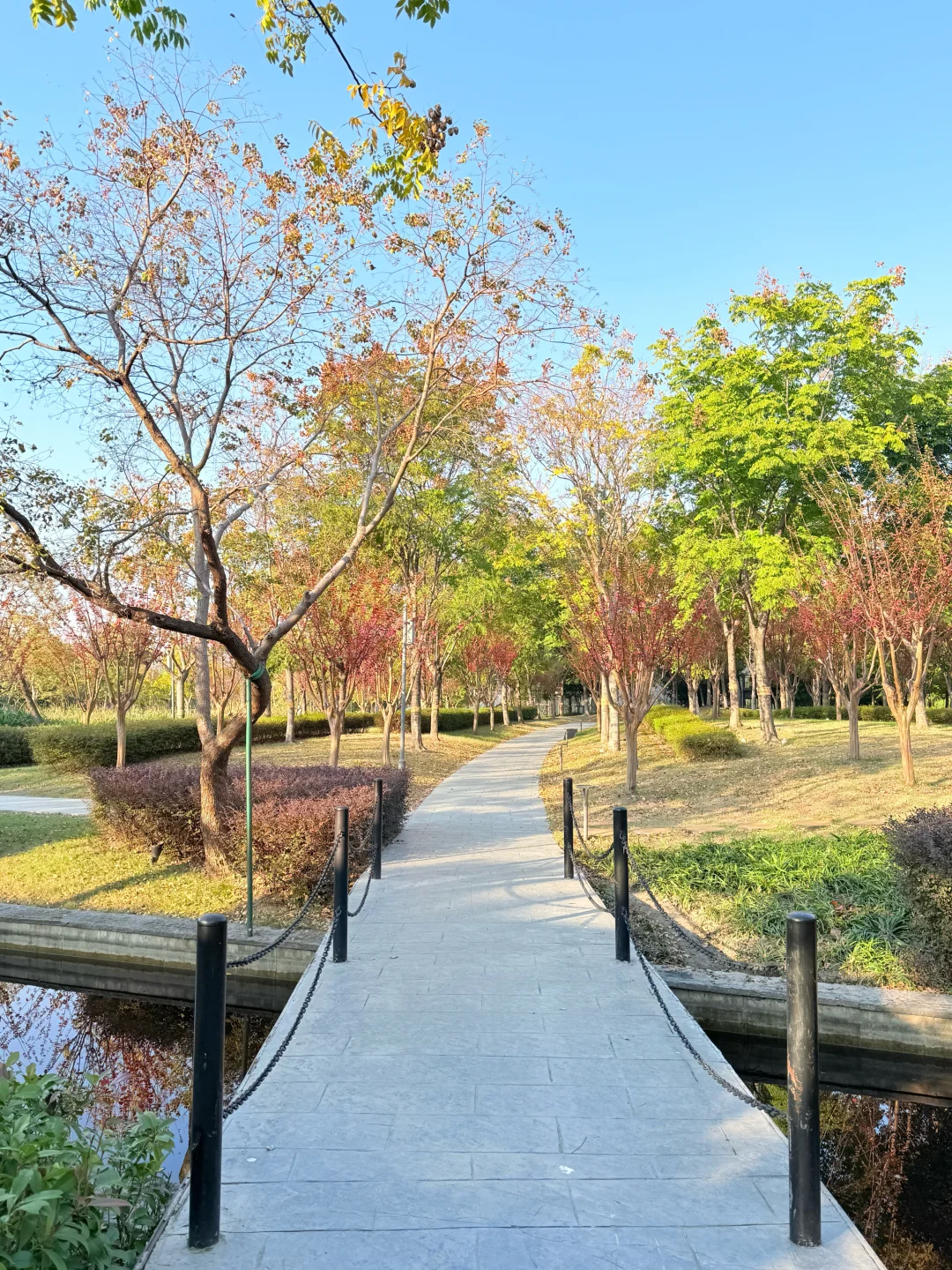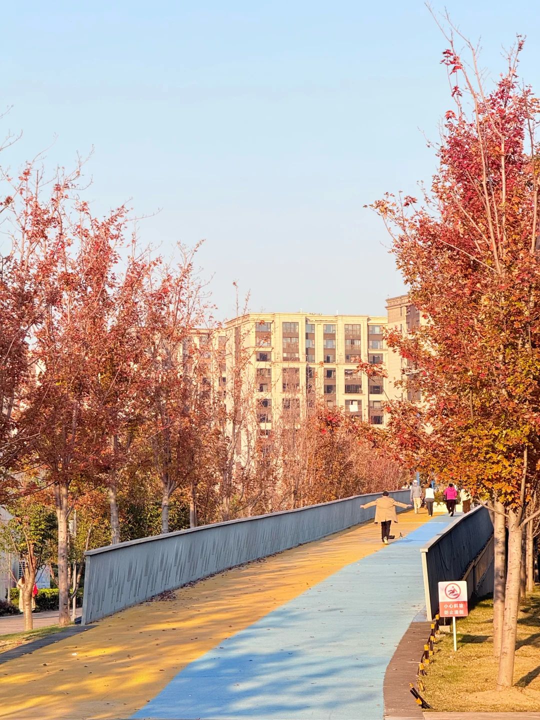 红叶季预计1个月,图片为11.20live实拍 人少景美的小公园,天桥、远处的欧式房子都很📷出片,🈶儿童玩乐区适合遛娃,苏河畔还能骑行~ 🍁11月中旬~12月中旬 📍上海云岭东路1000号 🚶推荐路线: 从北往南-儿童乐园-木栈道亲水平台-天桥-旋转楼梯-儿童乐园-枫叶小道