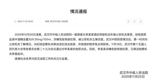 2025年10月26日凌晨,武汉市中级人民法院刑一庭原庭长李某某酒后驾驶机动车被公安机关查获,经检测其血液中酒精含量为91.55mg/100mL,涉嫌危险驾驶犯罪,被公安机关立案侦查。