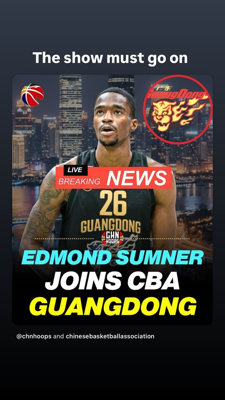 萨姆纳社媒转发了加盟广东的新闻,并配上了穿广东球衣P图,他写道:“表演必须继续!”