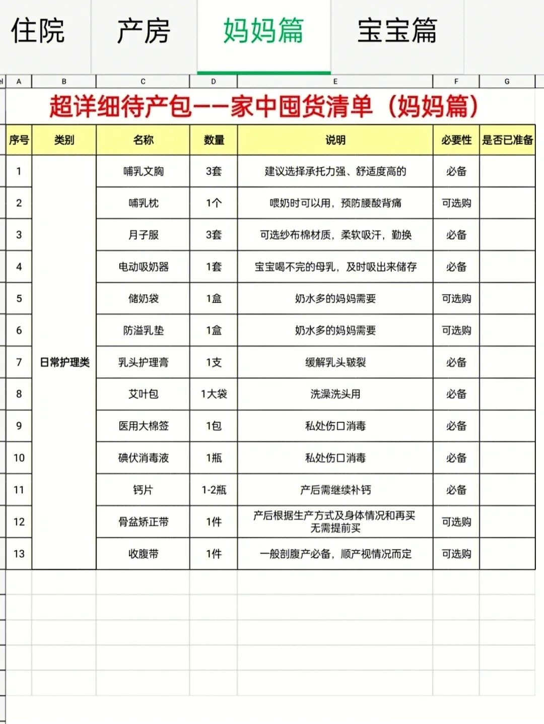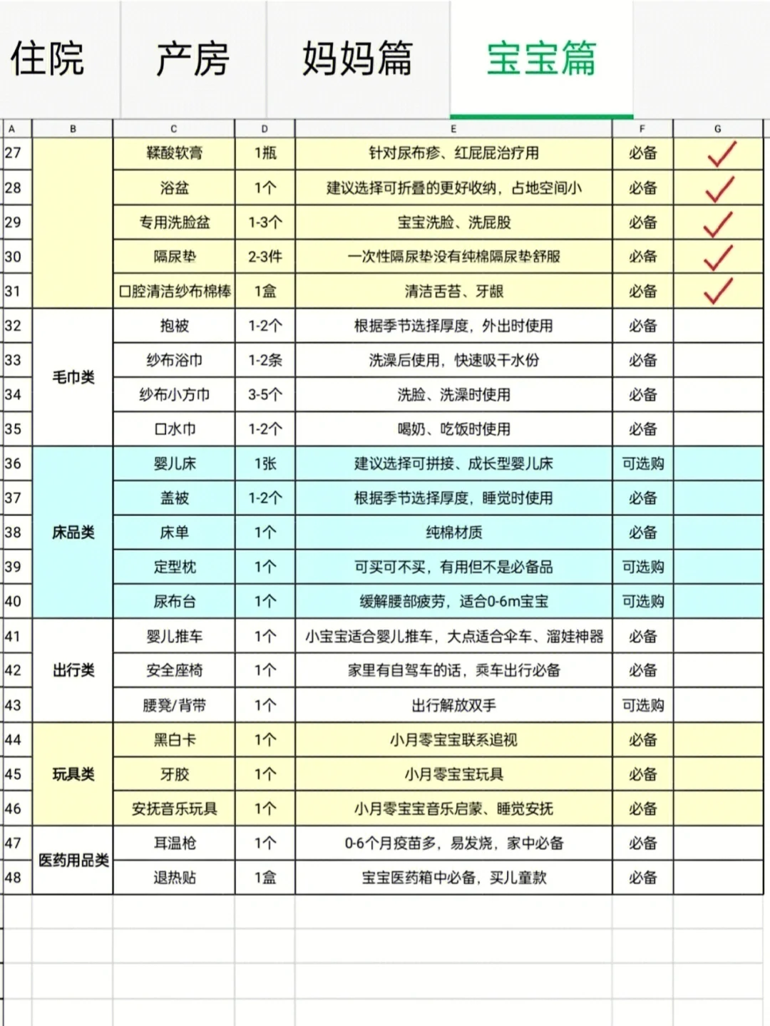 3. 最后一栏可以帮助孕妈跟踪准备进度,准备好的物品可“✔”哦。
